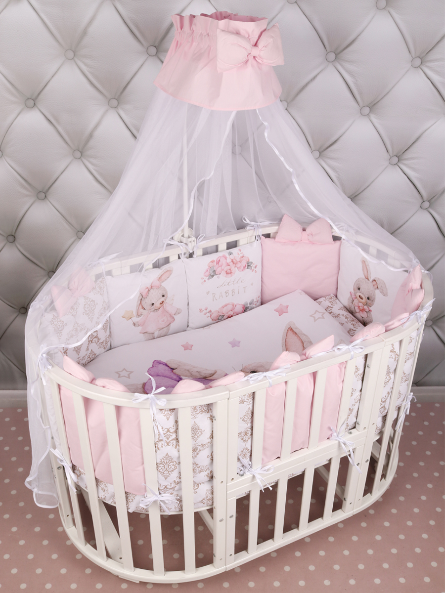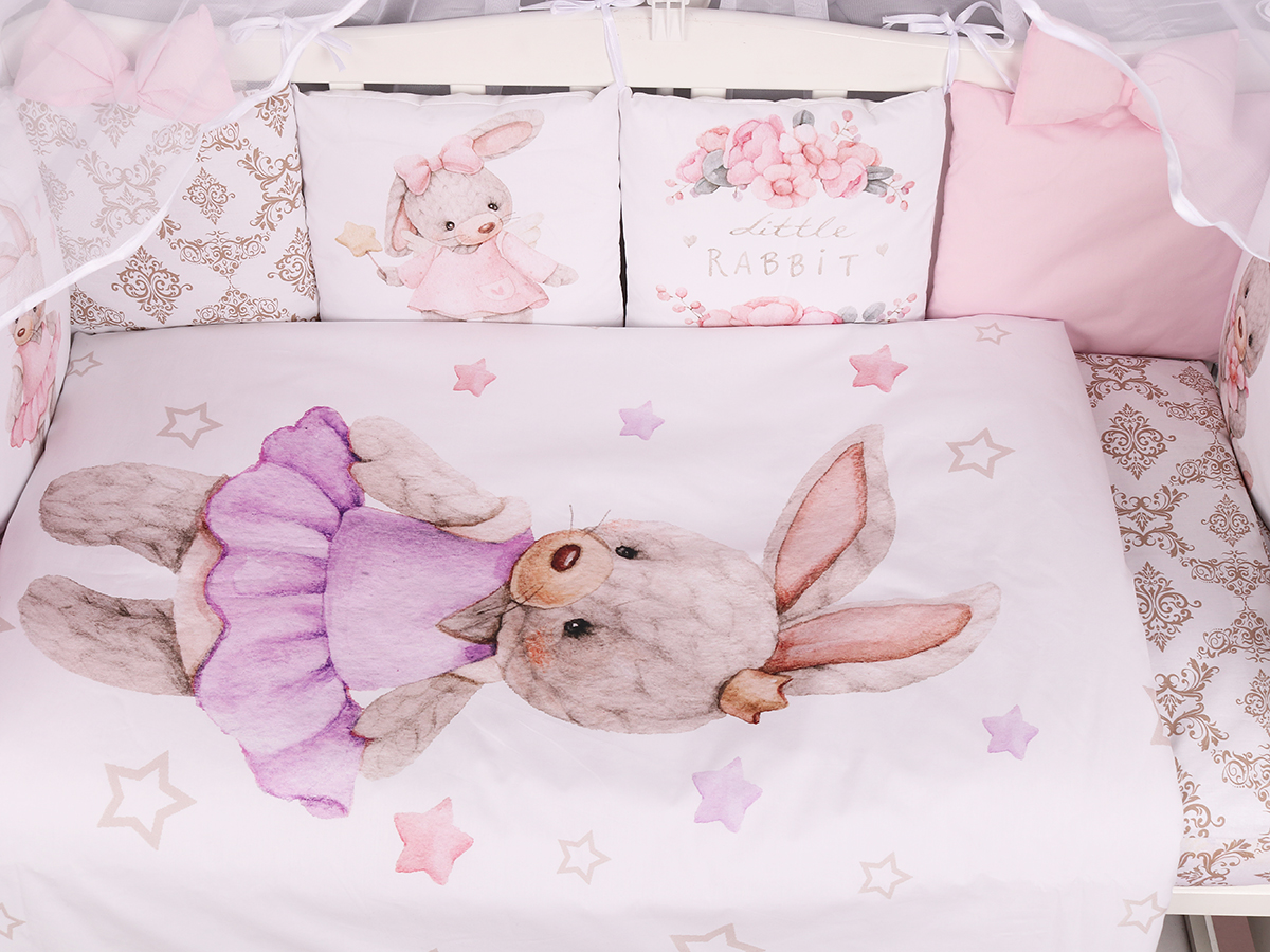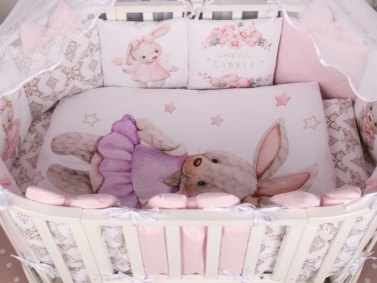 Бортик представлен в виде 12ти подушек на завязках, наволочки на бортиках съёмные. Мягкий наполнитель бортика обезопасит сон вашего малыша. Пододеяльник на молнии.