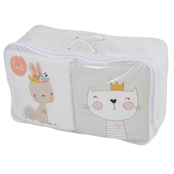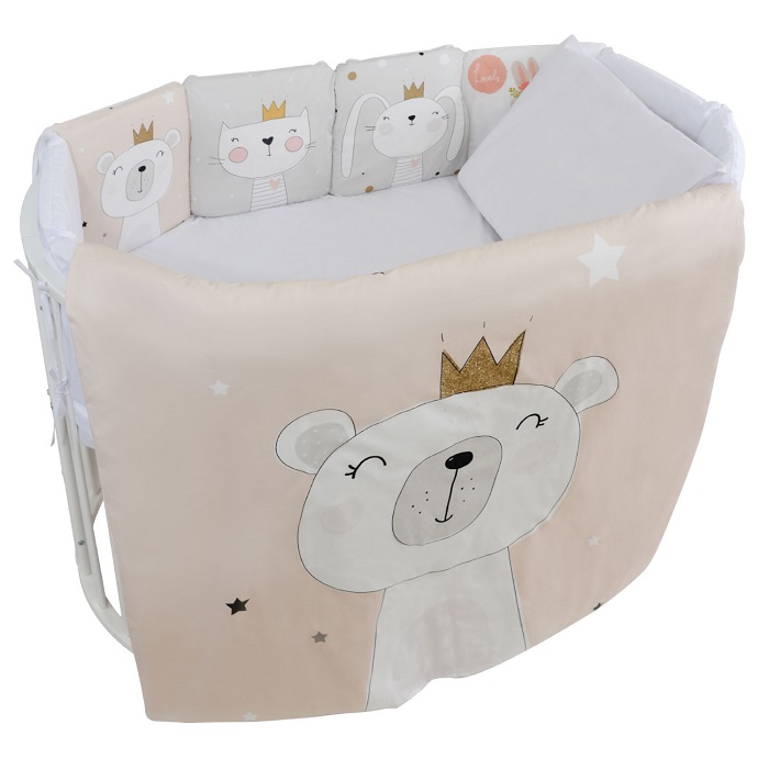 В комплект входят: мягкие бортики из 12 подушечек, одеяло, подушку, простыню на резинке, наволочку и пододеяльник. Все элементы выполнены из гипоаллергенного и дышащего хлопкового материала (перкаль-поплин) с цифровой печатью в нежном бежевом цвете.