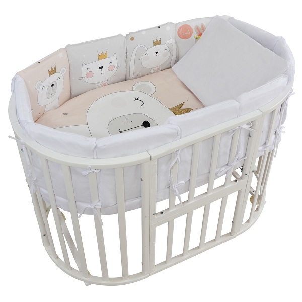 Борта, обеспечивающие комфорт и безопасность малыша, состоят из 12 отдельных подушечек размером 30х30 см, внутрь которых вставлен наполнитель 50 мм. Нижняя молния на каждой подушечке позволяет легко снимать и стирать чехлы, сохраняя их чистоту. Простыня на резинке универсальная, подойдет как для овальной, так и для стандартной прямоугольной кровати.