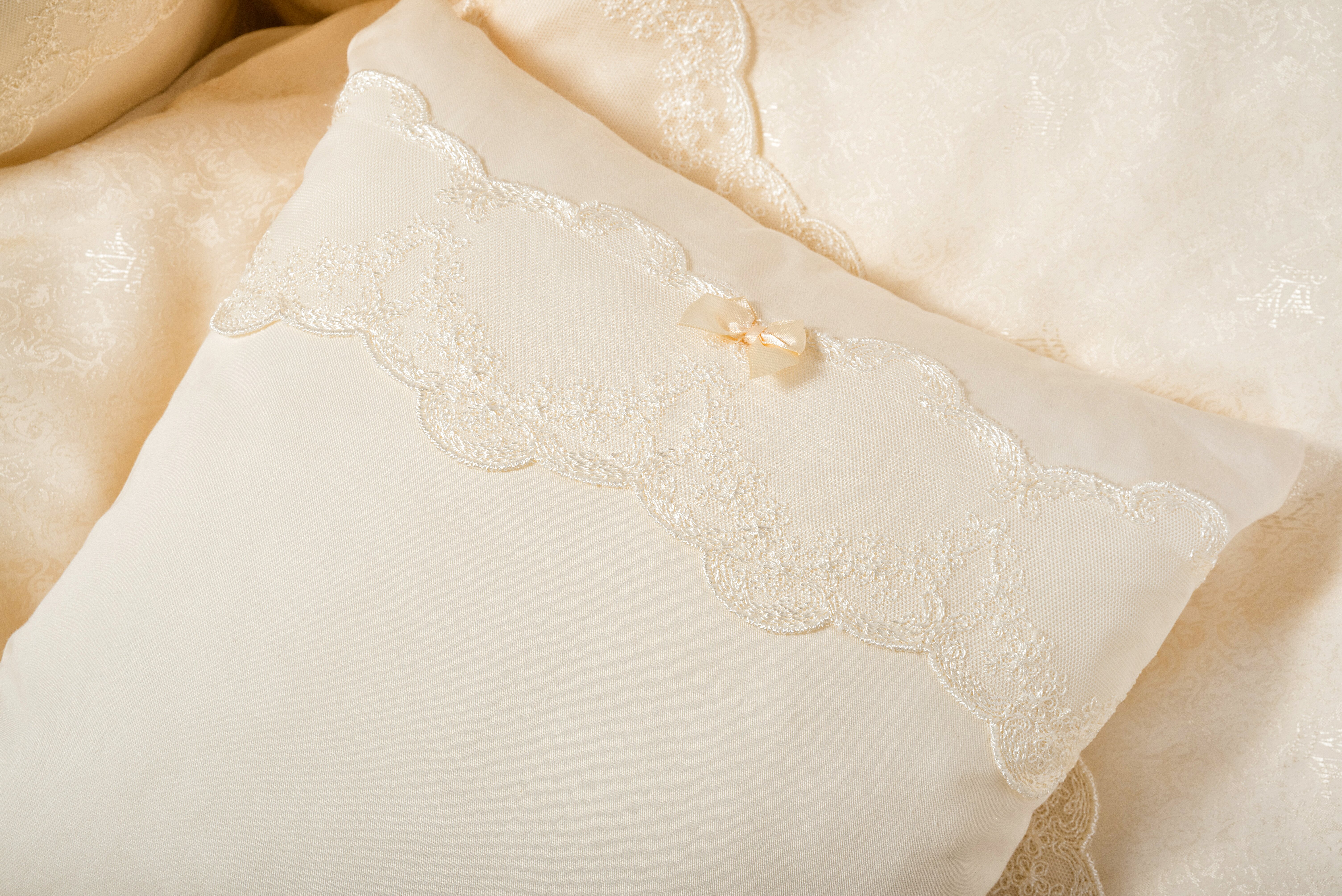 Комплект в кроватку Nuovita Corona (нуовита корона) - набор бортиков и постельного белья в кровать для новорожденного. Комплект для тех, кто ценит детали, аккуратную вышивку, нежное кружево, фактуру и структуру ткани. Это очень красивый комплект. Очень нежный, воздушный. Большое количество небольших подушек позволит маме самой решать полностью закрыть кроватку бортиками или частично. В дальнейшем такие подушечки можно использовать для декора, игр или сна.