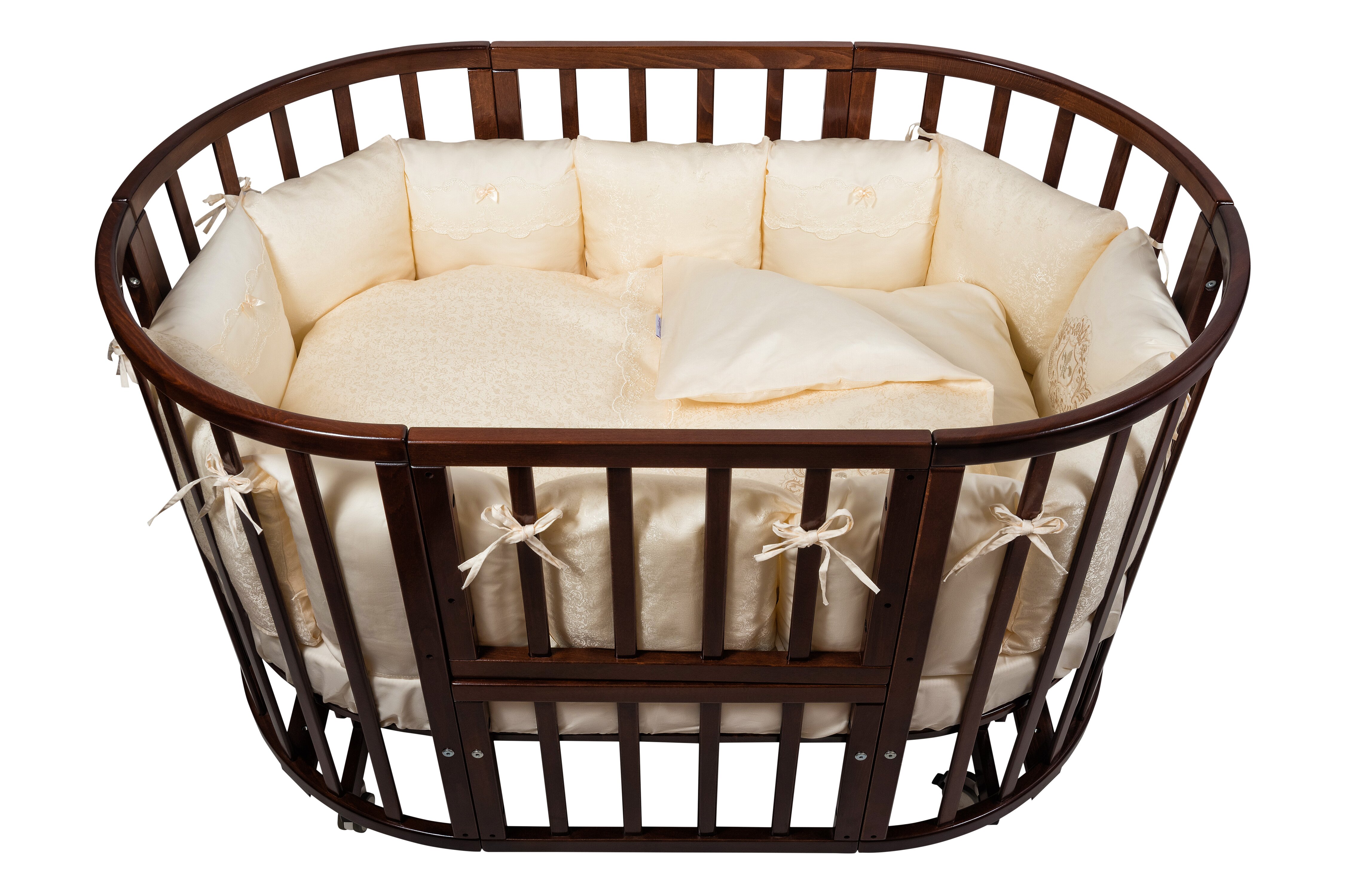 Качественная ткань очень приятна на ощупь, легка в стирке и бортики прекрасно держат форму. Все постельные принадлежности и чехлы на бортиках – 100% хлопок, а значит, вашему ребенку в такой кроватке будет удобно, комфортно и не жарко.
