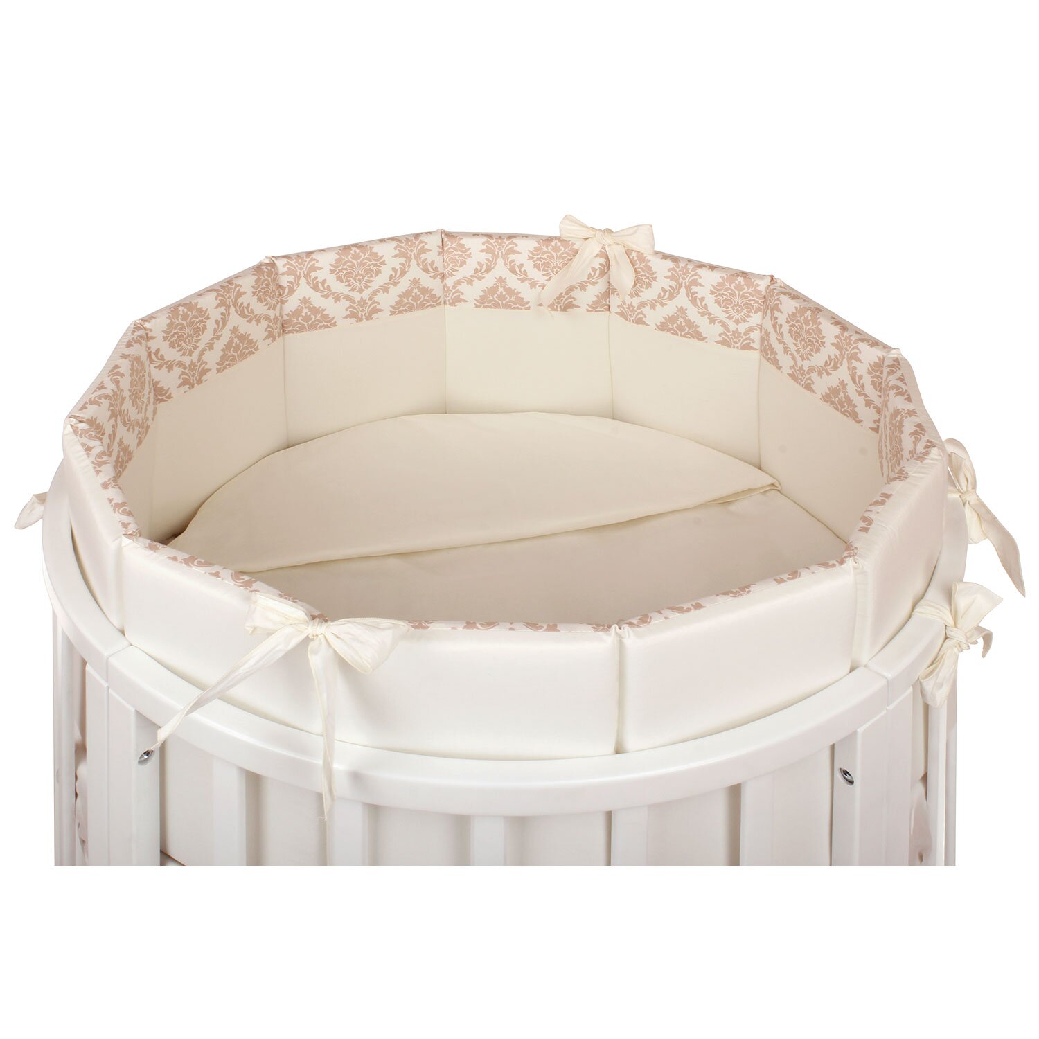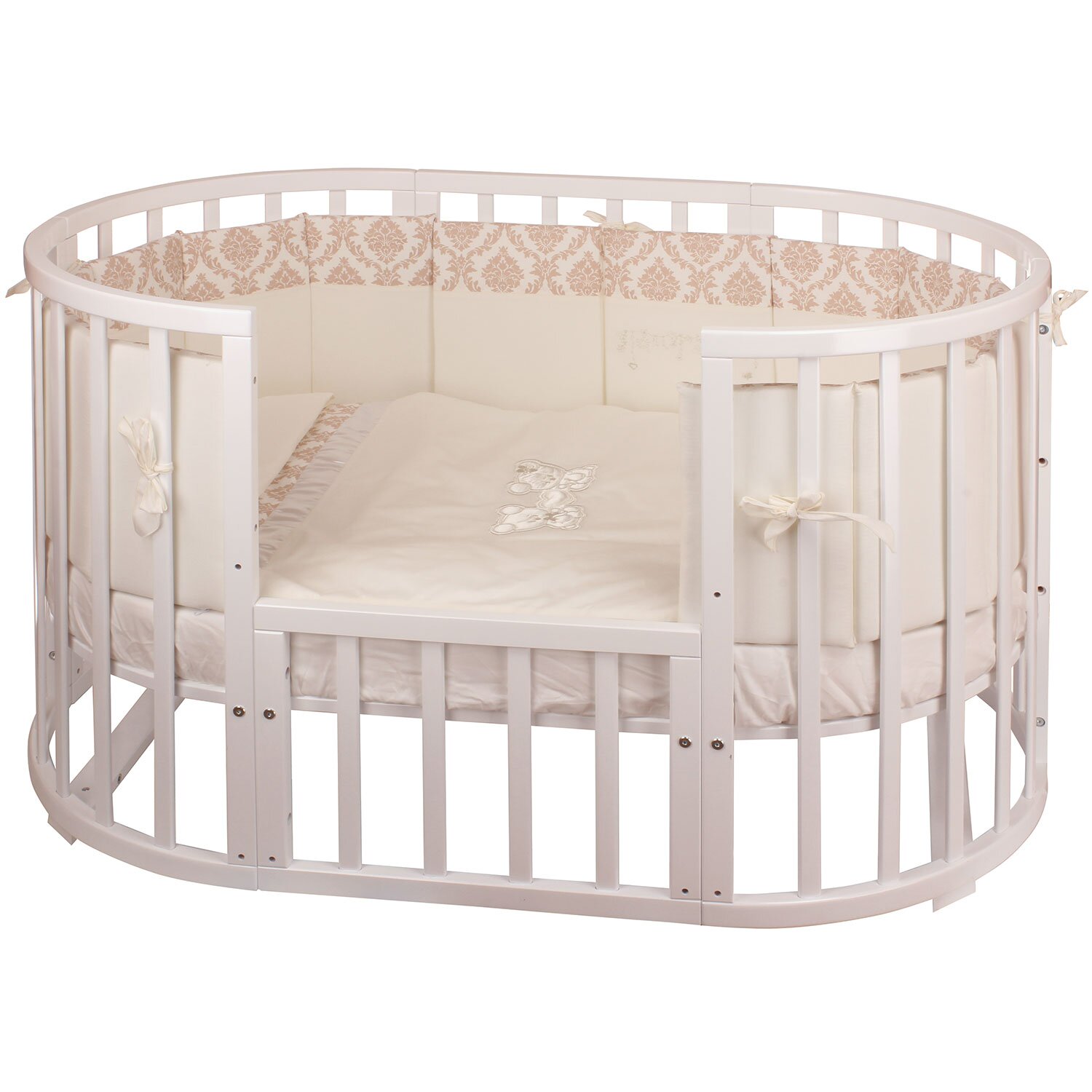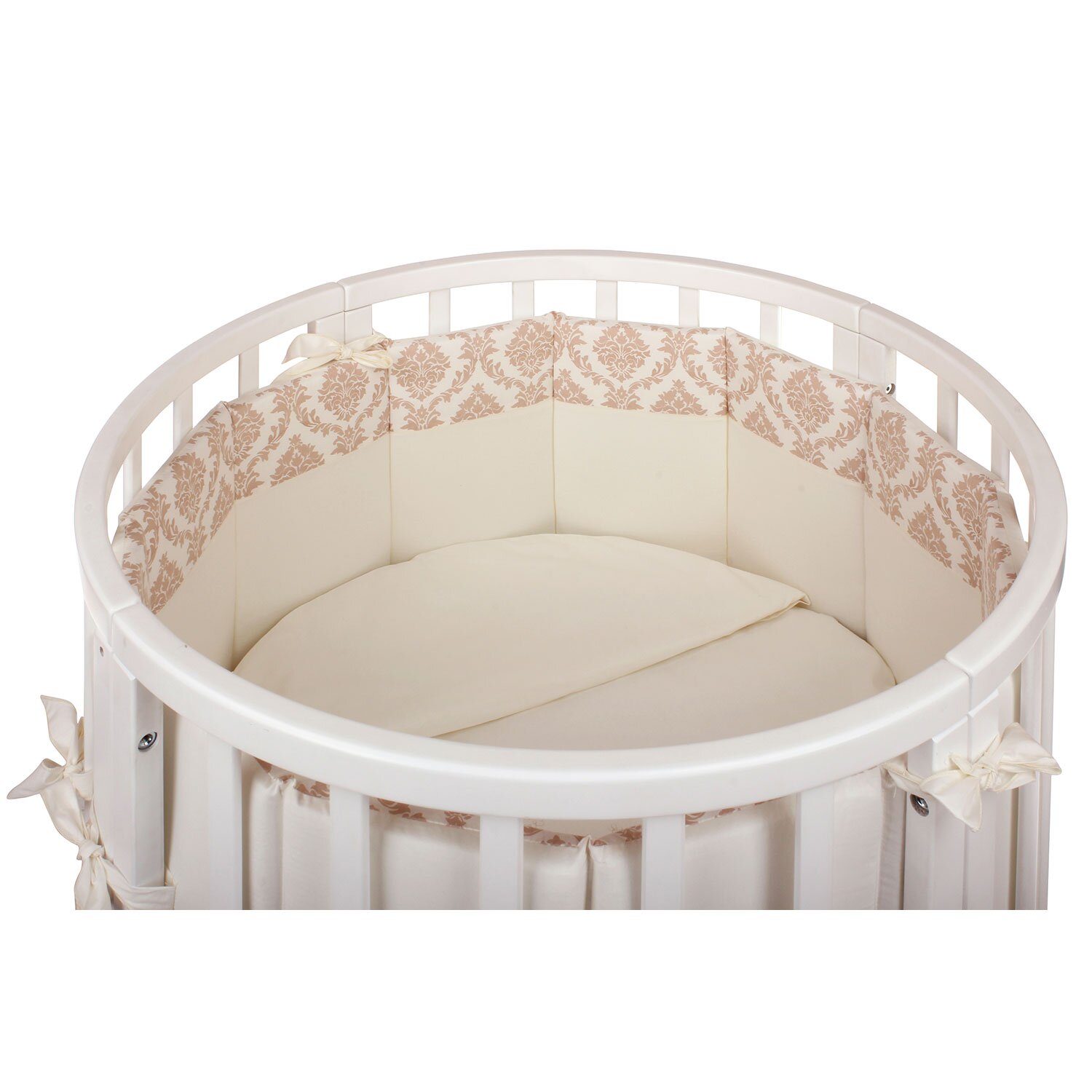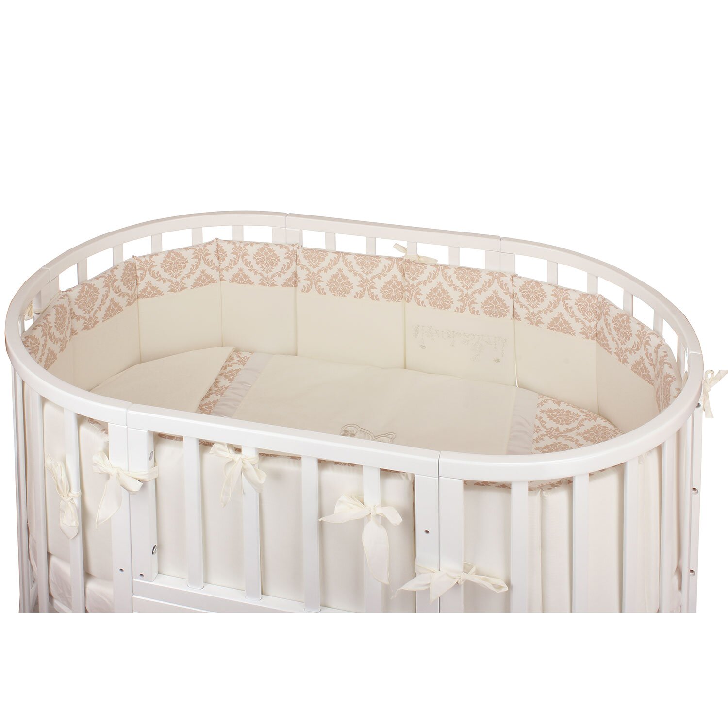 Комплект в кроватку NUOVITA Due Orsi (нуовита) - красивый комплект с очень нежным узором. Состоит набор из 4 бортиков, которые удобно крепятся на круглую или овальную кроватку с помощью ленточек. Такие бортики создадут в кроватке уютное и безопасное гнездышко для новорожденного малыша. Так же в комплекте подушка и 2 одеяла, внутри которых бамбук и гипоаллергенный холлкон, очень мягкий и приятный материал. Для удобства мамы все простыни на резинках, что поможет быстро и легко одевать их на матрас.
