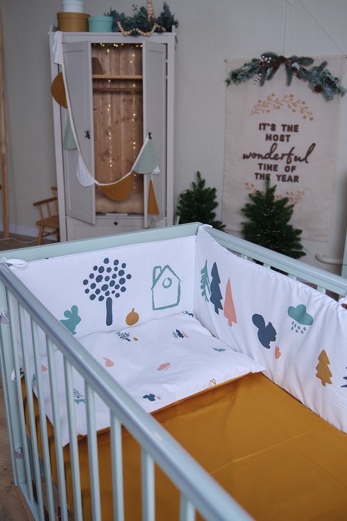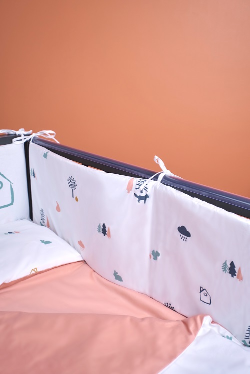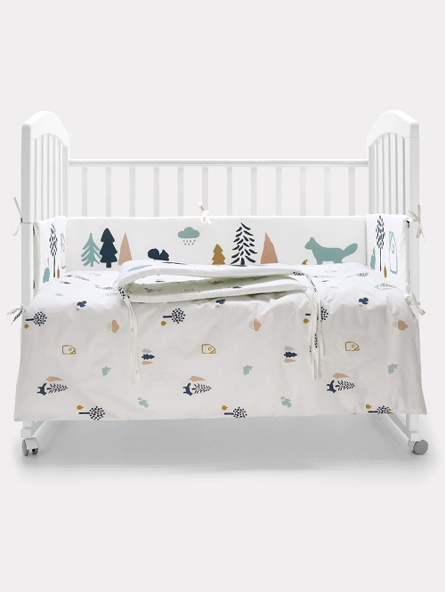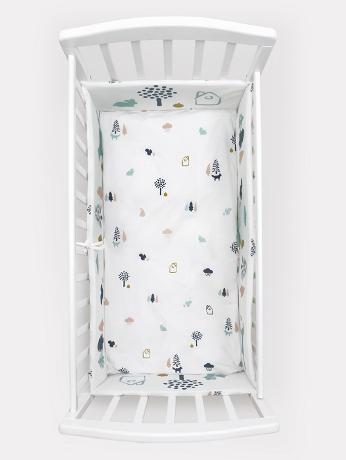 - удивительные деревья, животные, тучки и домики удобно расположились на всех бортиках, пододеяльнике и наволочке. Простыня и тыльные стороны пододеяльника и наволочки выполнены в монохромном цвете, идеально сочетающимся с принтом.