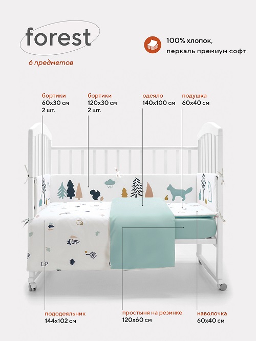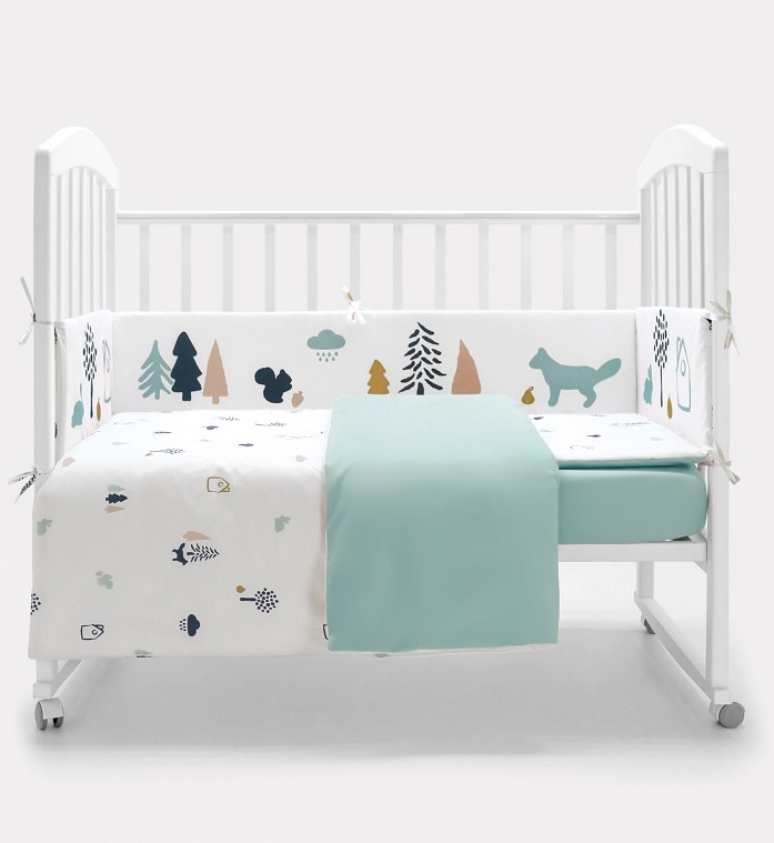Комплект в кроватку Rant Forest 6 предметов (Рант форест) - качественное постельное белье с бортиками на кроватку 120-60 см. Комплект включается в себя все необходимое для подготовки кроватки для сна новорожденного. Комплект выполнен из 100% хлопка премиум класса. Красивый и нежный рисунок обязательно заинтересует ребенка, когда тот немного подрастет.