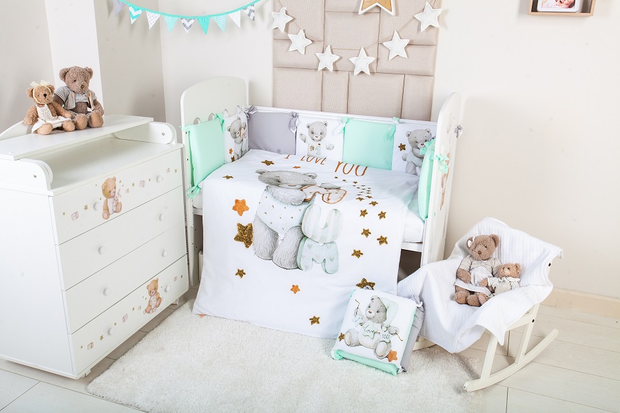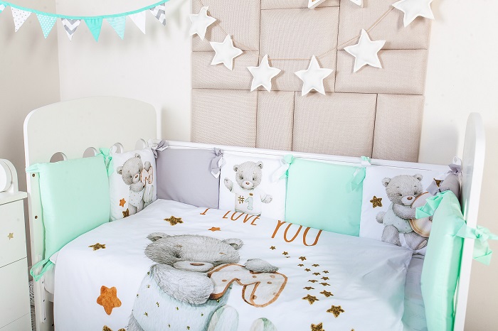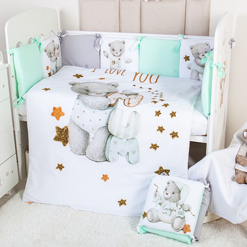 - Бортики: подушки на завязках, 30х30 см, 12 шт. (4 шт. с принтом медвежонок, 4 шт. мятные, 4 шт. серые)