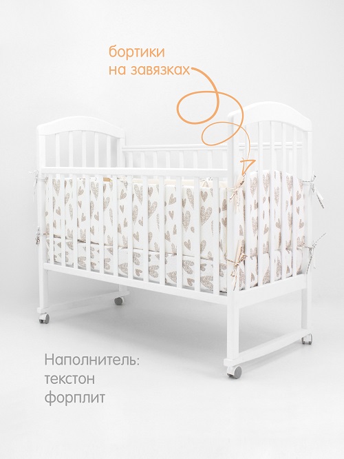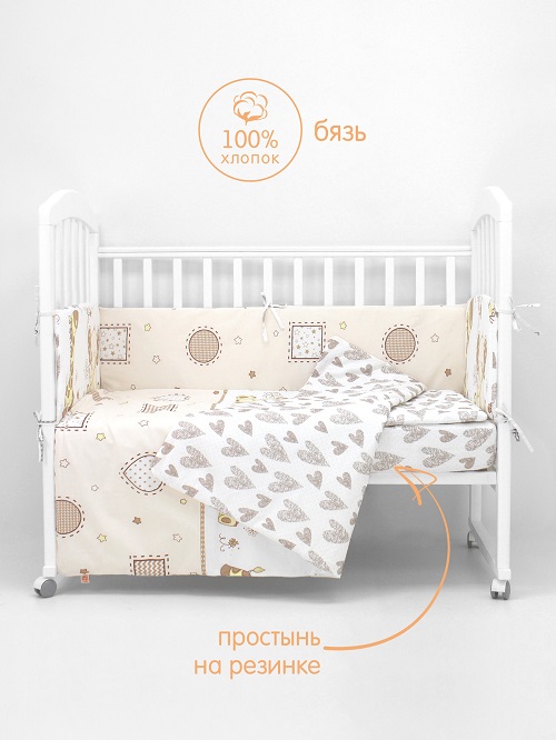 - комплект абсолютно экологичен и безопасен для крохи. Выполнен из 100% хлопка (бязь). Наполнитель бортиков, подушки, одеяла - текстон, форплит.