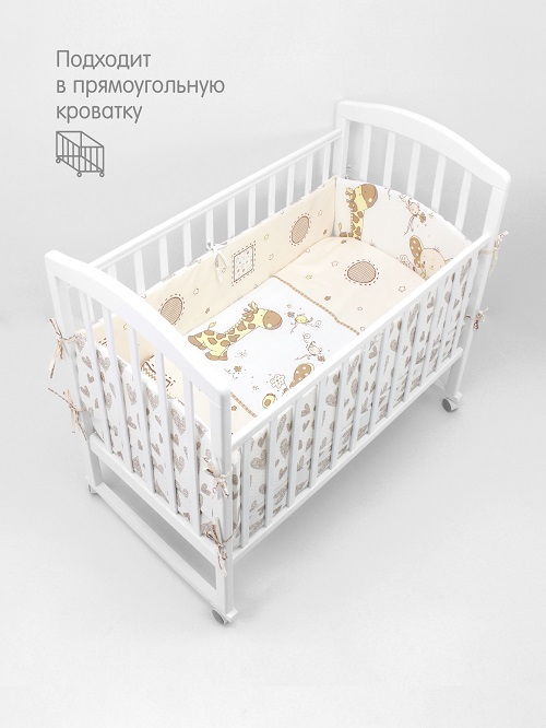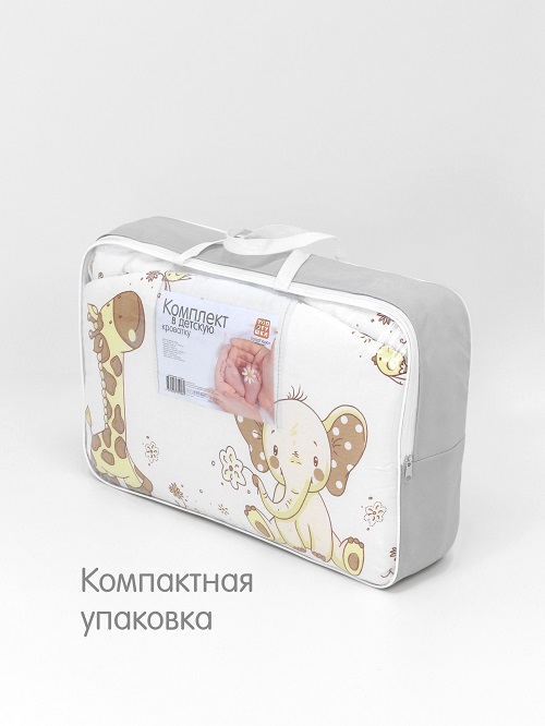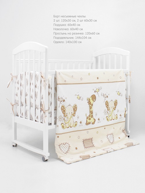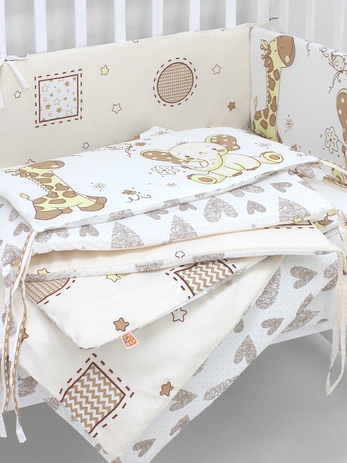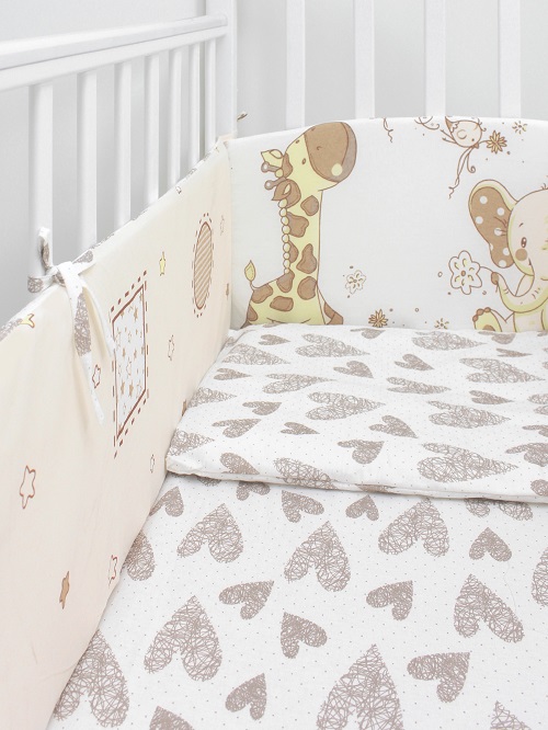 - роскошный комплект с дизайнерскими принтами в виде забавных зверят - слоника и жирафа - обязательно понравится вашему малышу. Обратите внимание на тыльную сторону пододеяльника и бортиков, которые обладают принтом в виде сердечек.