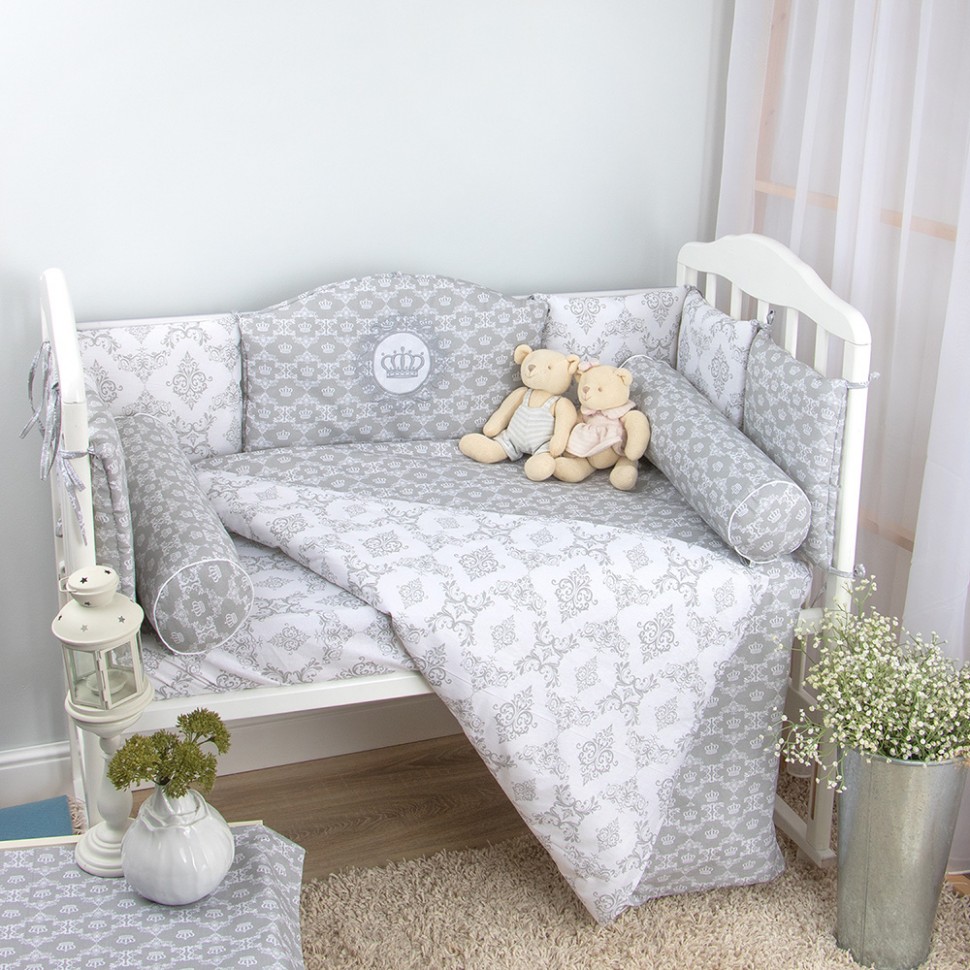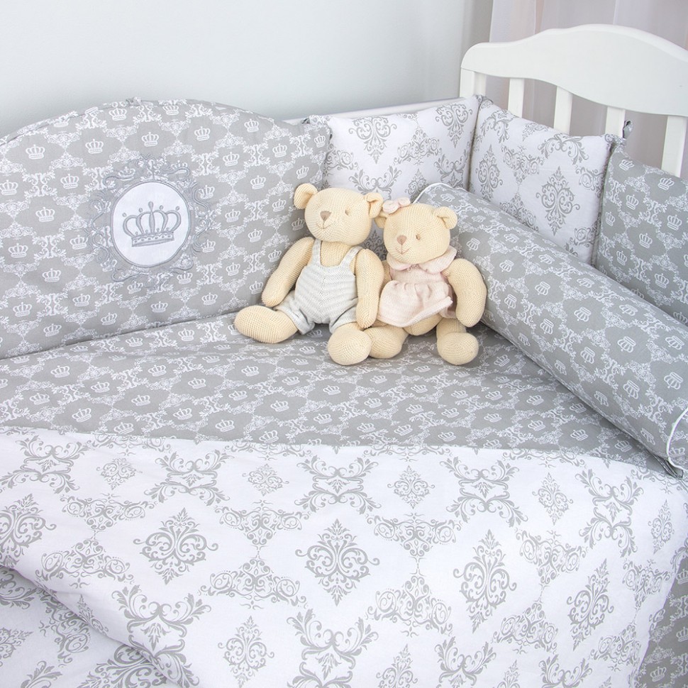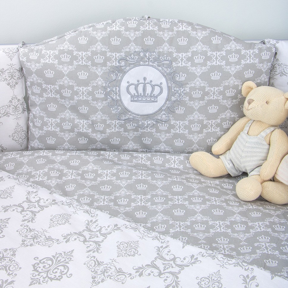 Комплект Золотой Гусь "Королевский" универсальный 14 предметов - роскошный комплект в кроватку выполнен из хлопковой ткани с рисунками в серой гамме. Комплект дополнен набором подушек-бортиков с изысканным изголовьем украшенным королевской вышивкой и двумя ролик-подушками. Все подушки выполнены с завязками для фиксации в кроватке, что даёт возможность комбинировать и применять их по своему усмотрению. Комплект состоит из 14 предметов.