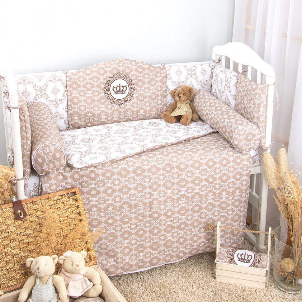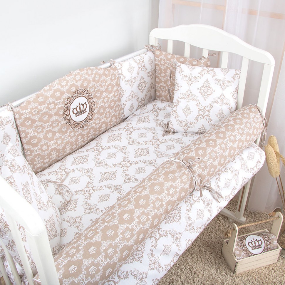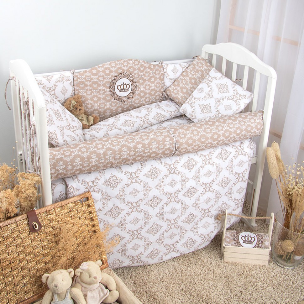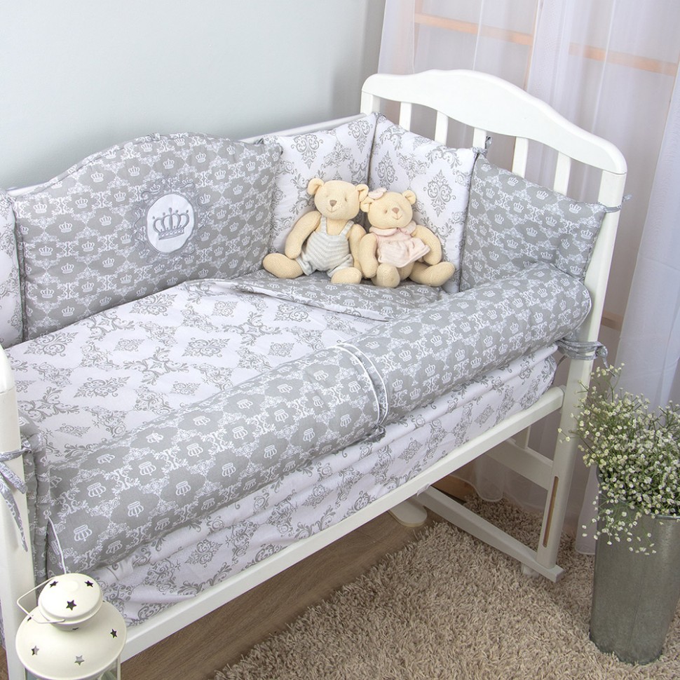 Комплект Золотой Гусь "Королевский" универсальный 14 предметов - роскошный комплект в кроватку выполнен из хлопковой ткани с рисунками в серой гамме. Комплект дополнен набором подушек-бортиков с изысканным изголовьем украшенным королевской вышивкой и двумя ролик-подушками. Все подушки выполнены с завязками для фиксации в кроватке, что даёт возможность комбинировать и применять их по своему усмотрению. Комплект состоит из 14 предметов.