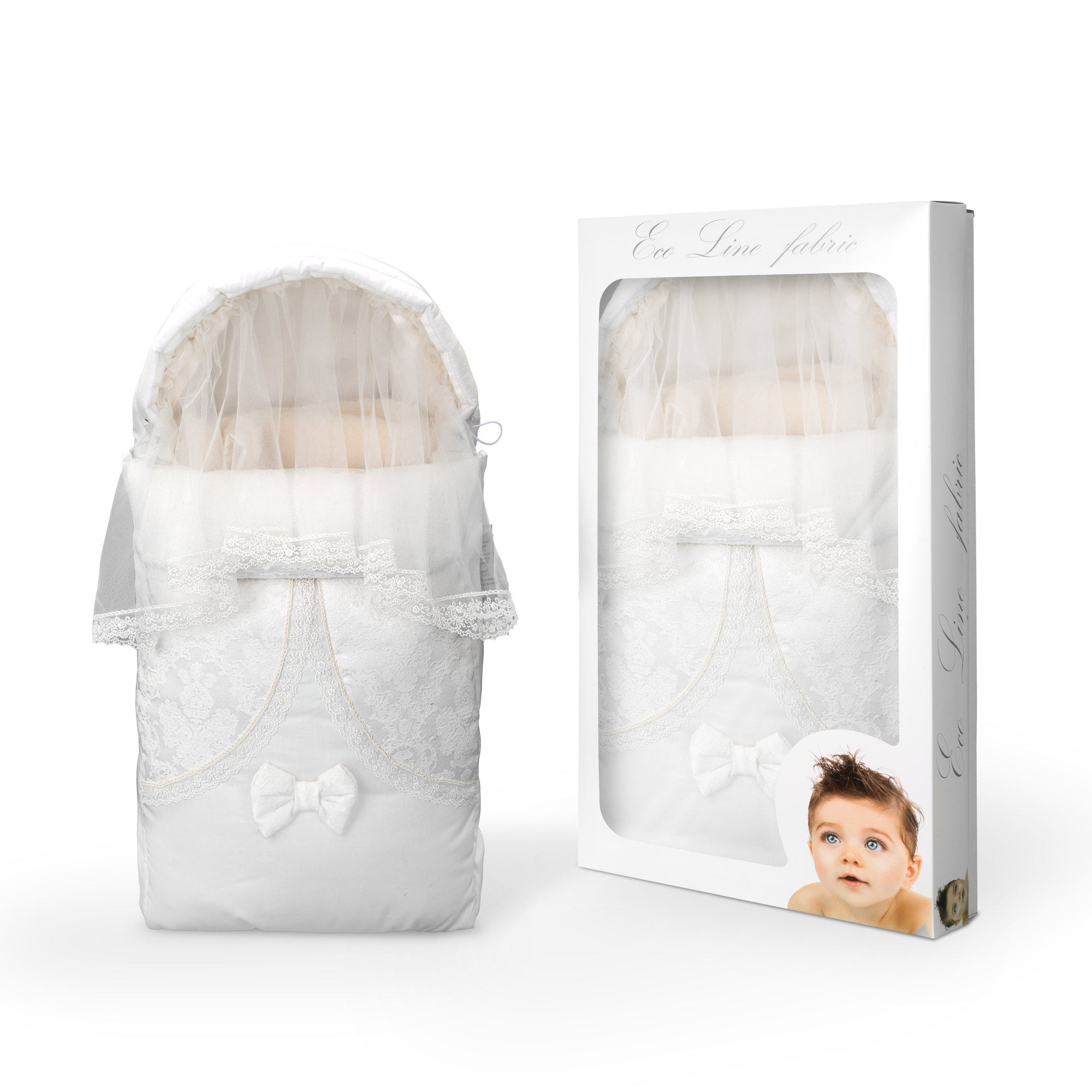 Конверт на выписку Ecoline Винтаж (Эколайн) - очень красивый и нежный конверт на торжественную выписку из роддома. Украшен кружевом, съемной вуалью и бантиком. В дальнейшем конверт может использоваться для прогулок в коляске.