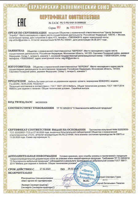 - качественная кроватка из массива березы. Без острых углов. Прекрасно отшлифованная. Покрытая только безопасными красками и лаками. Есть сертификат "О безопасности детской продукции".