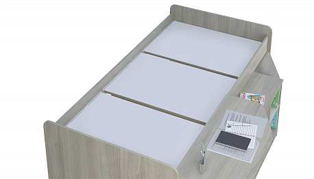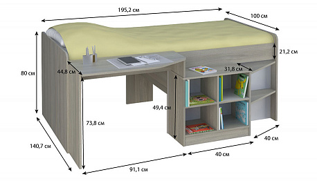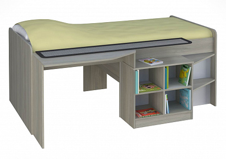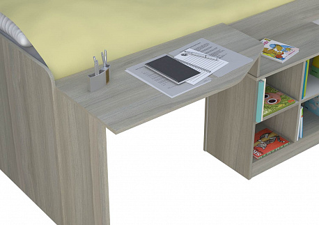 - включает в себя: кровать, письменный стол и открытые полки,