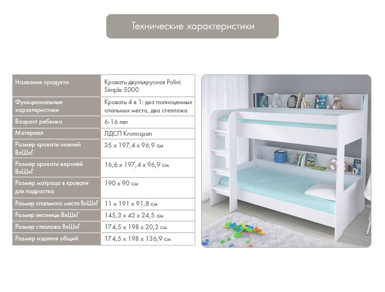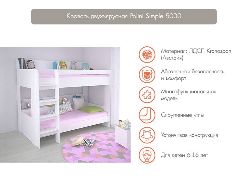 Кровать-чердак двухъярусная Polini Simple 5000 (Полини симпл) - удобная и очень практичная двухъярусная кровать для двоих детей от 6 до 16 лет. У каждого ребенка будет большое спальное место 190х90 с удобной полочкой для вещей, книг, игрушек. Верхняя кроватка (ярус) дополнен специальным бортиком , для безопасного сна ребенка.