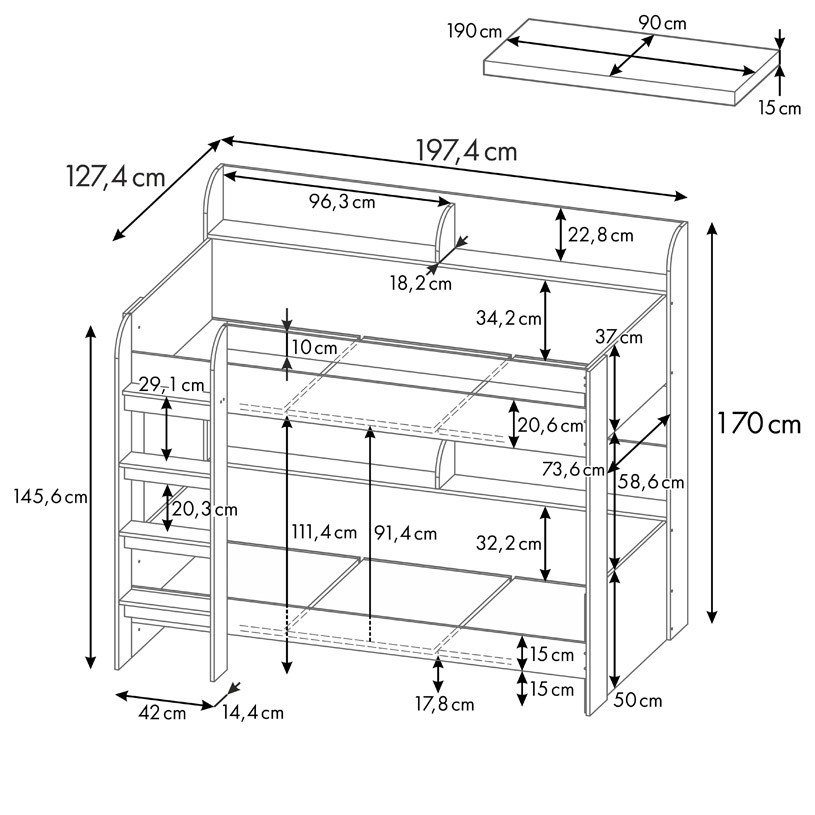 - Размер кровати нижней (ВхШхГ): 350х1974х969