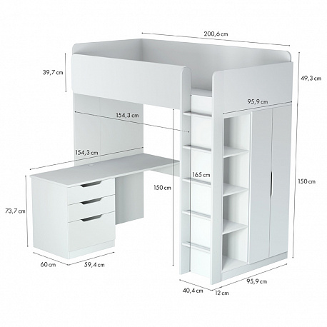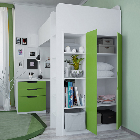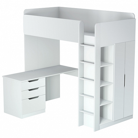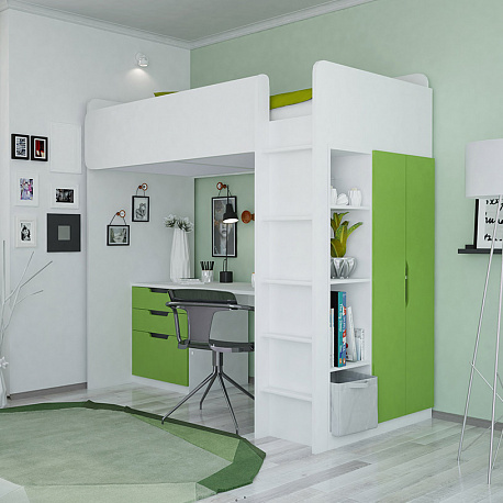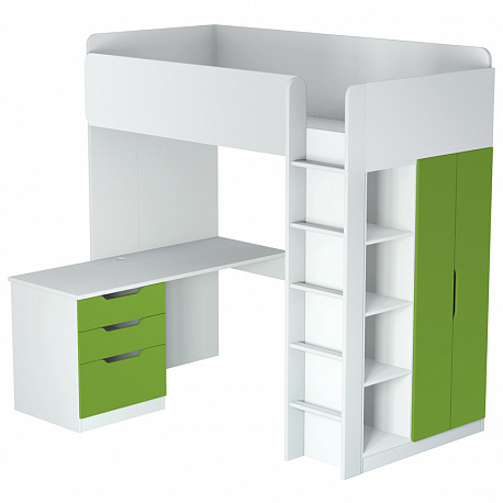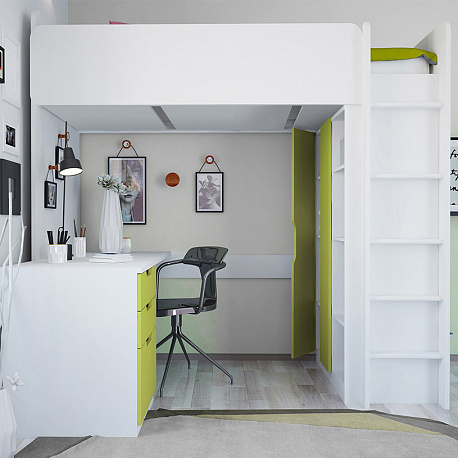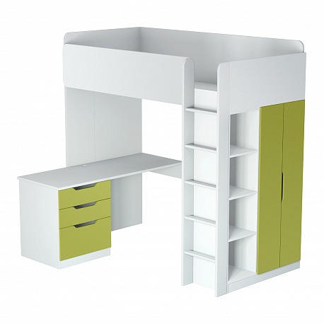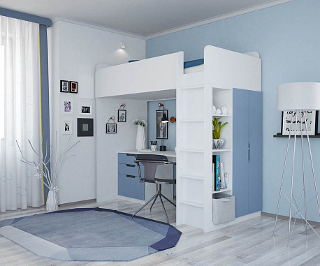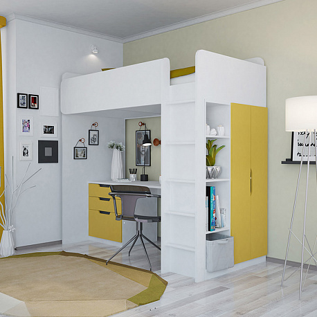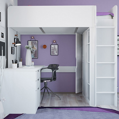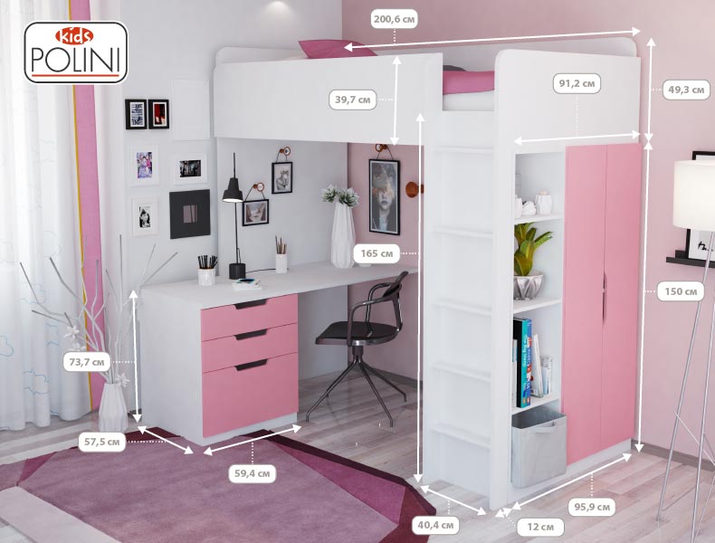 Кровать-чердак Polini Simple (Полини Симпл) - очень функциональный и практичный комплект детской мебели для ребенка от 6 лет. Это комплект мебели, который позволит полностью оборудовать детскую комнату всем необходимым. В комплект входит детская кровать размерами 200х90 см, что позволит пользоваться кроватью до примерно 16 лет. Кровать выдерживает большую нагрузку. Высокие борта обезопасят ребенка от падения, и создадут дополнительный уют. Вход на второй этаж (спальное место) осуществляется с помощью лесенки. Лестница оснащена специальной фрезеровкой, которая защитит от скольжения.