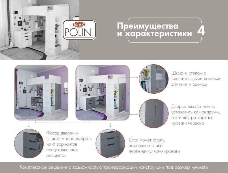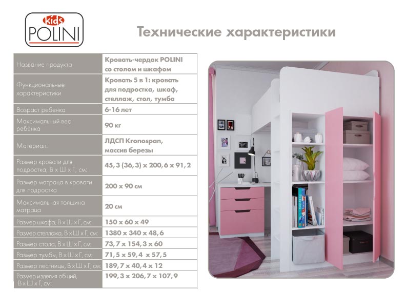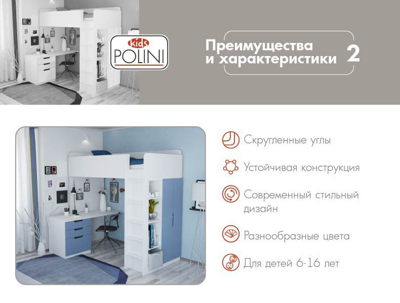 Особенности кровати - чердака Polini Simple: