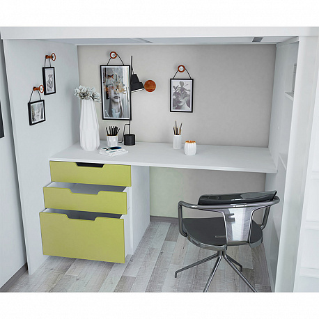 На "первом" этаже расположено большое рабочее пространство с полноценным столом и большими ящиками. Это станет удобным местом для занятий и уроков. Для проводов уже предусмотрены специальные отверстия, поэтому подключение компьютера или зарядки для телефона не станет проблемой и не испортит общий вид рабочего места. 3 вместительных ящика под столом позволят идеально разместить все для школы.