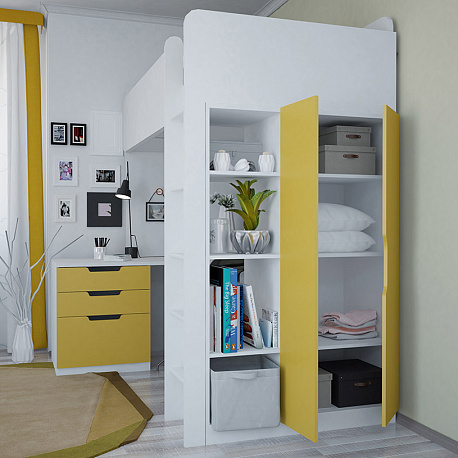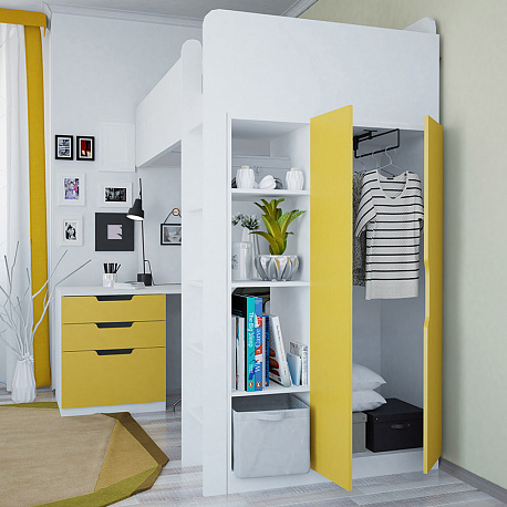 - Модель включает в себя все самое необходимое для полноценной жизнедеятельности: подростковую кровать, стеллаж, шкаф, стол, тумбу.