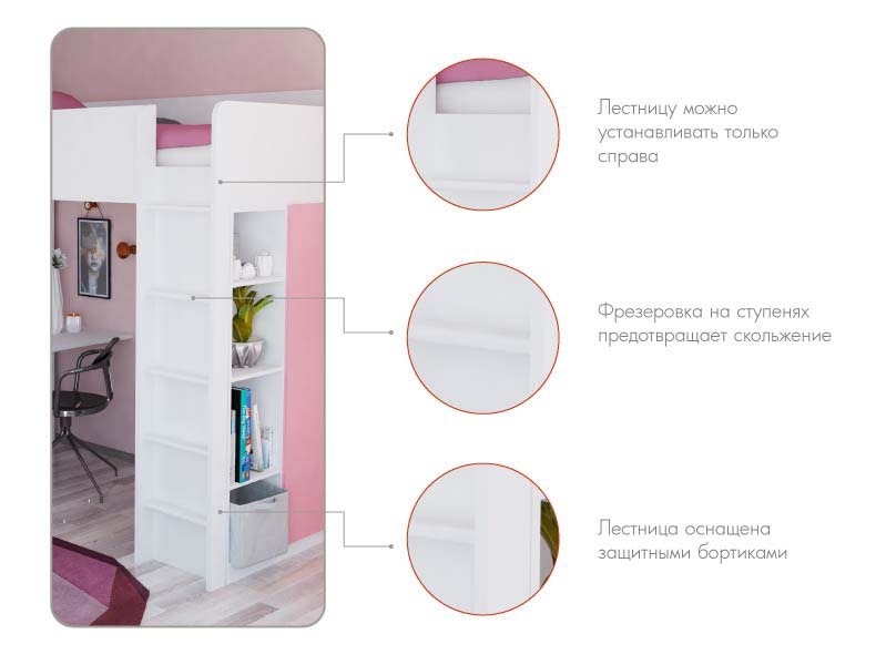 Модель является аналогом кровати - чердака СТУВА Икея (IKEA), но представлена в более широкой цветовой гамме (белый - розовый, белый - синий, белый - серый, белый - зеленый, белый - желтый, белый).
