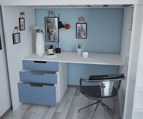- Стол, тумба и шкаф располагаются под кроватью для экономии пространства в комнате.