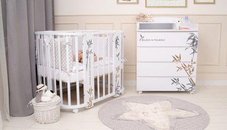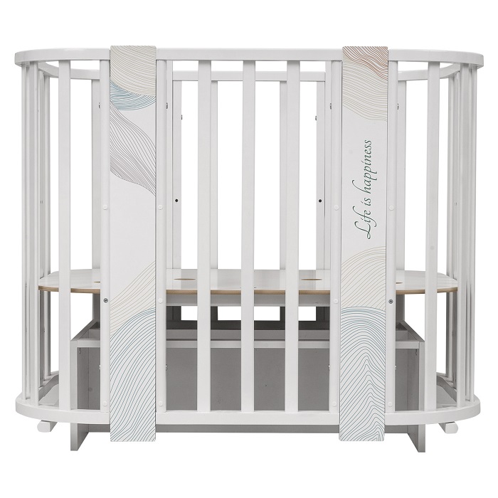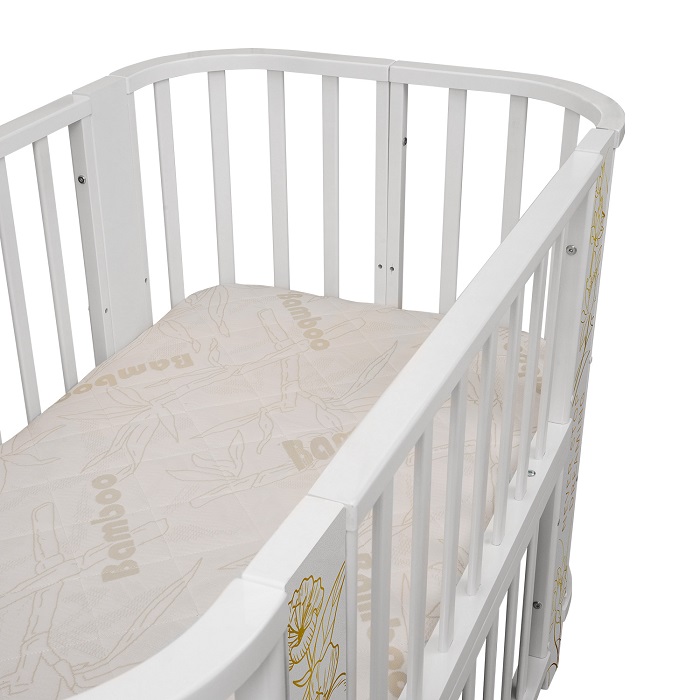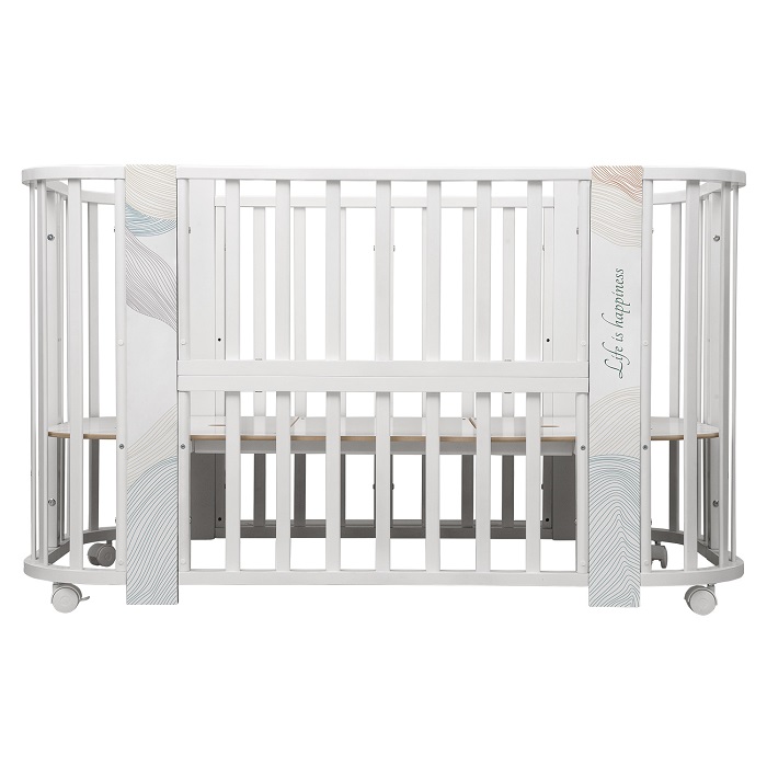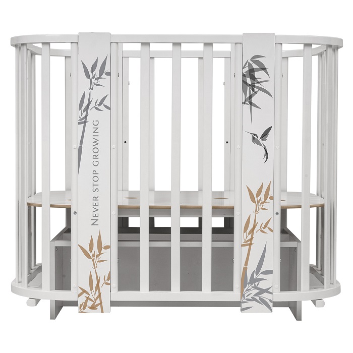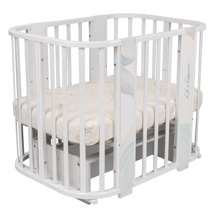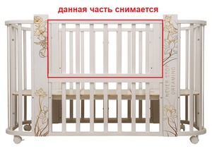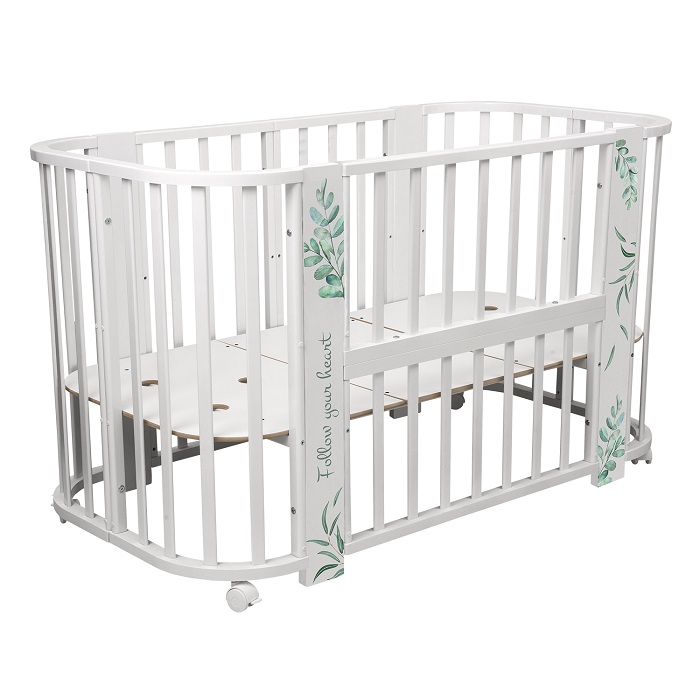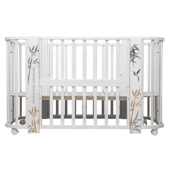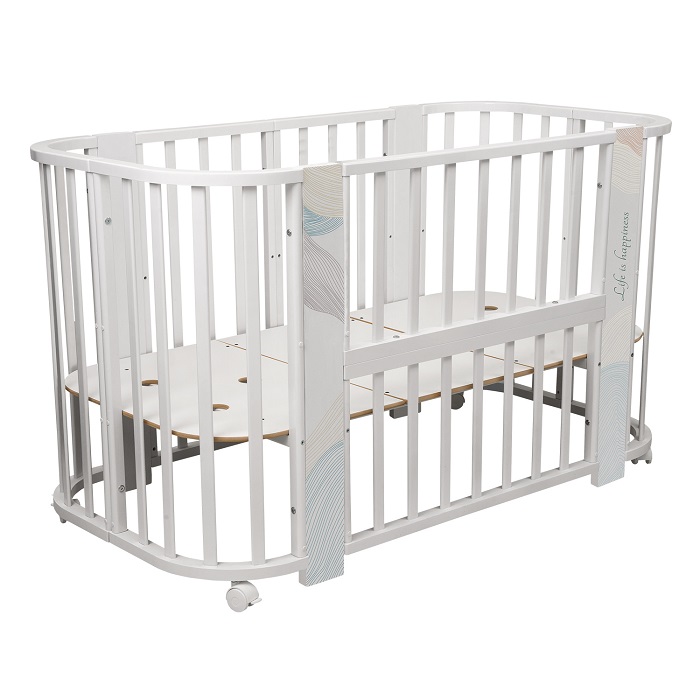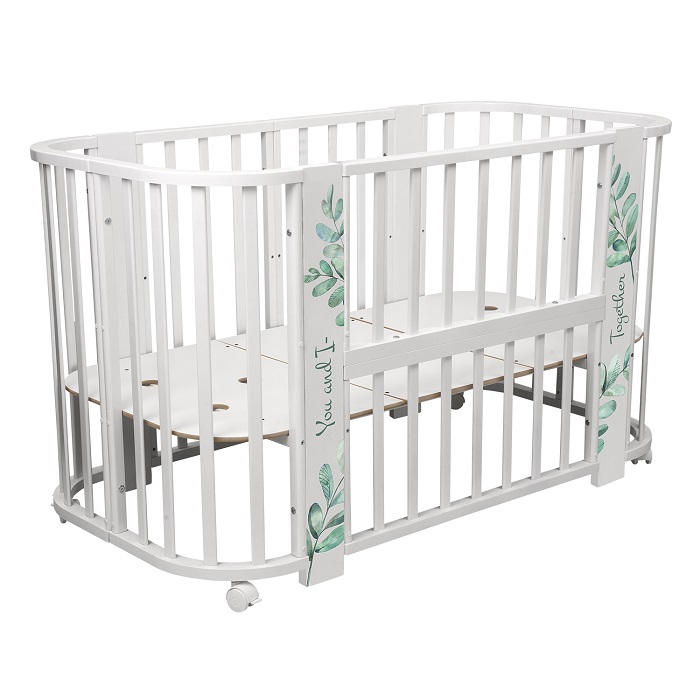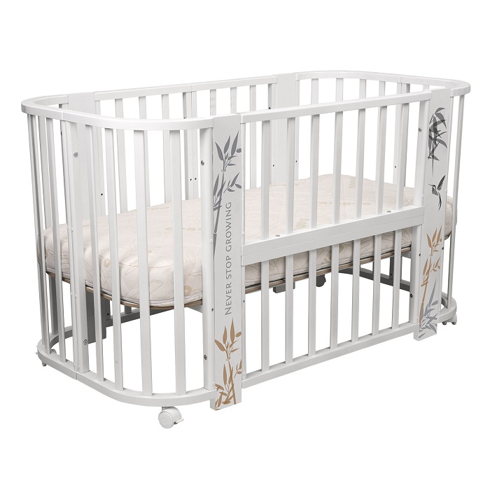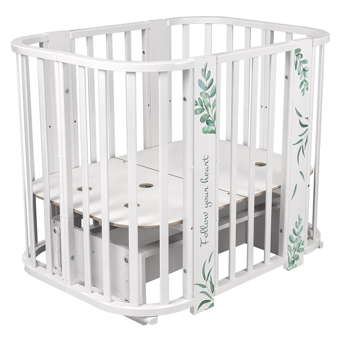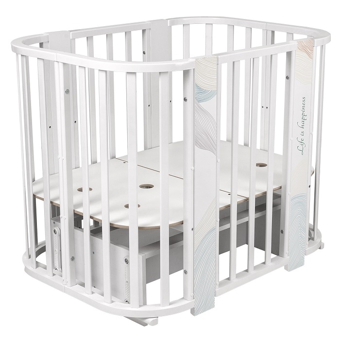 При увеличении кроватки до 70*140 см появляется возможность снять один бортик и использовать кроватку как диванчик или приставную кровать (для этого нужно отрегулируйте высоту основания под матрас на одном уровне со взрослой кроватью). Также конструкцию можно трансформировать в игровой манеж с высокими бортиками и полным обзором.