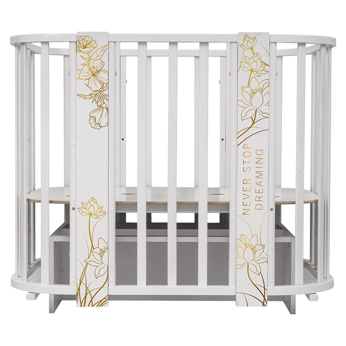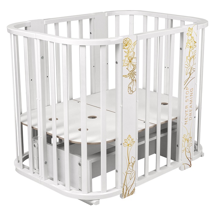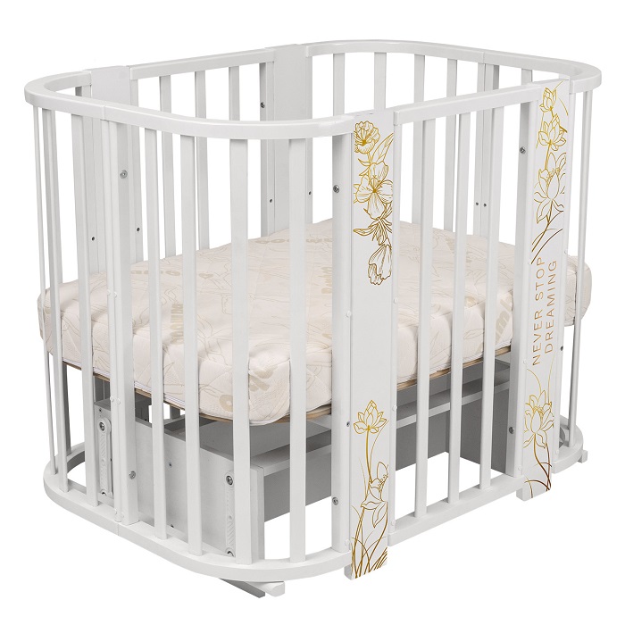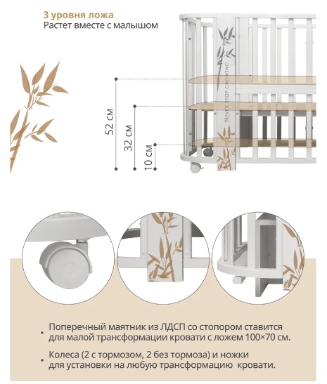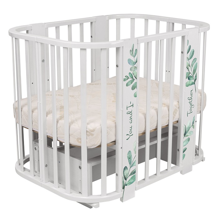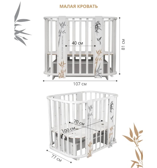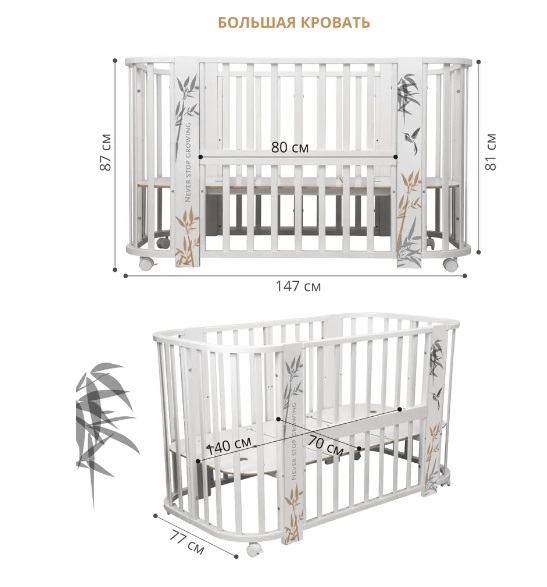 - Трансформации: маленькая кроватка (ложе 100*70), большая кроватка (ложе 140*70), приставная(100*70), диван (140*70), манеж.