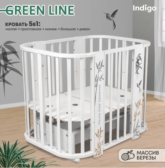 Indigo Green Line 5 в 1- кроватка трансформер, которая подойдет для ребенка с рождения до подросткового возраста. Кроватка с 70*100 см, благодаря деталям в комплекте увеличивается до 70*140 см, позволяя использовать кроватку максимально долго.