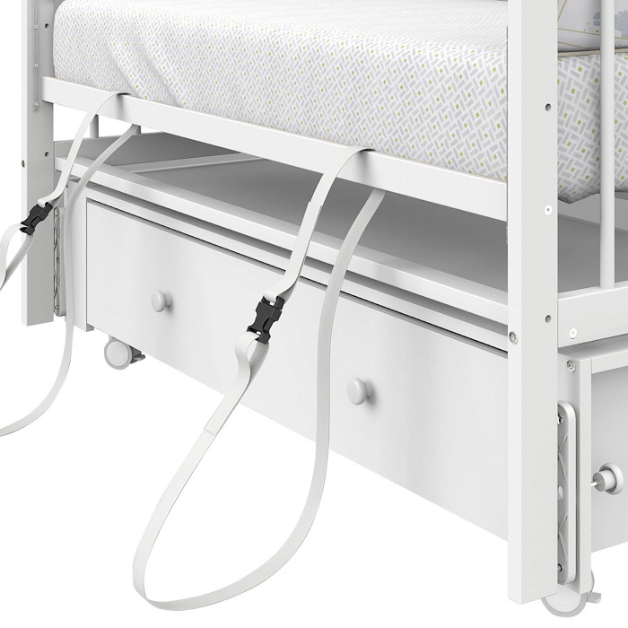 В кроватке предусмотрено три уровня высоты ложа с шагом 96 мм — верхний (498 мм), средний (402 мм) и нижний (306 мм), что позволяет адаптировать модель под разный возраст ребенка. Передняя стенка опускается для удобства ухода за ребенком, а также может быть полностью снята для использования кроватки как приставной, что позволит малышу быть рядом с мамой в течение всей ночи.