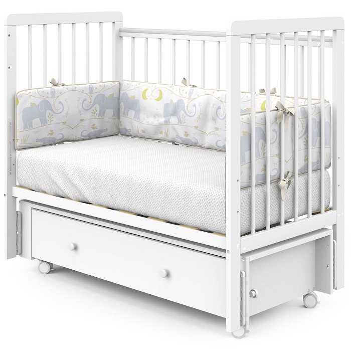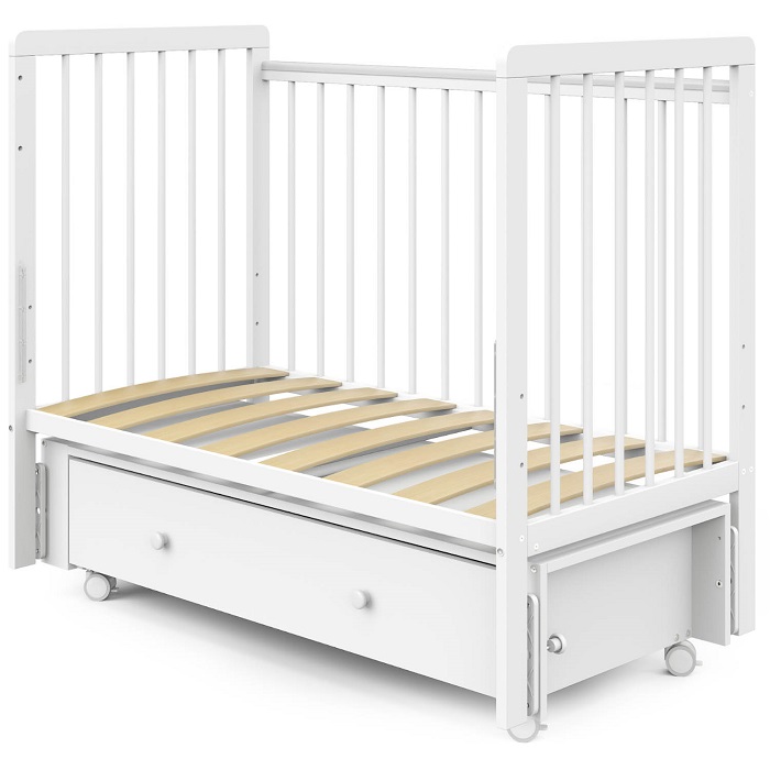 - Опускающаяся съемная передняя стенка — удобство ухода за малышом и возможность использования кроватки как приставной к родительской.