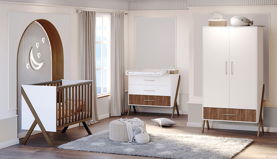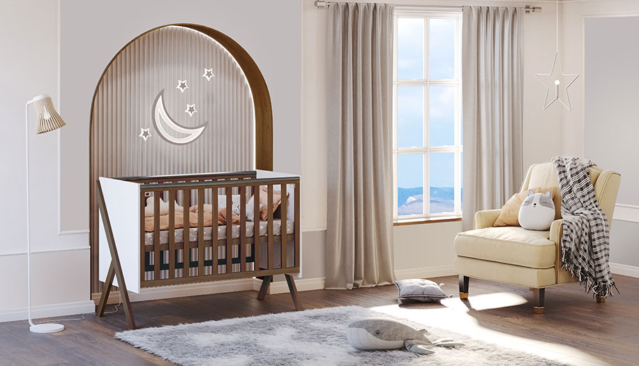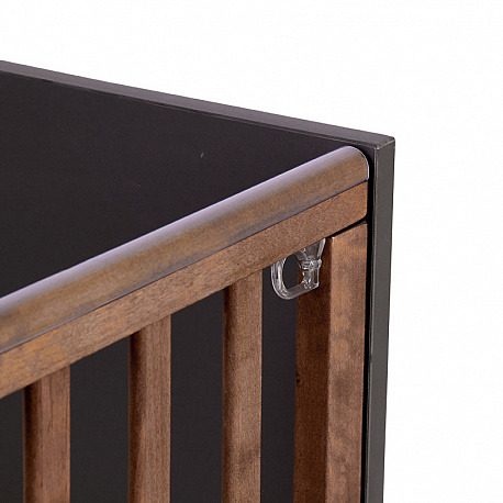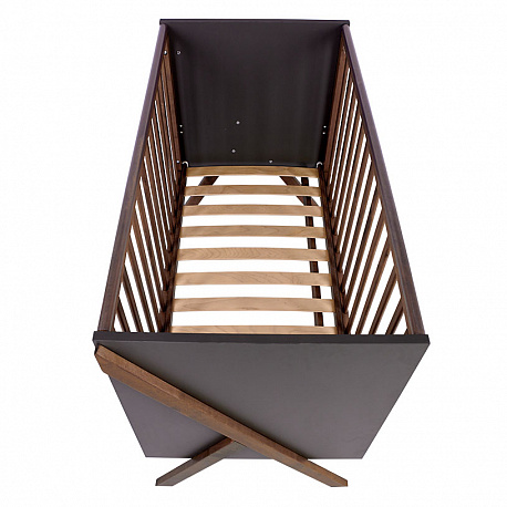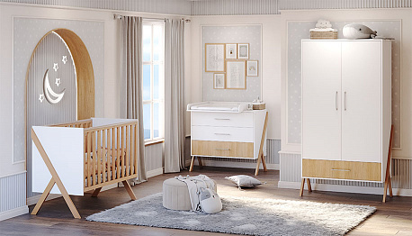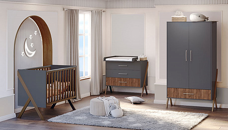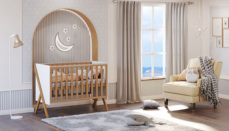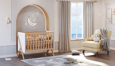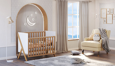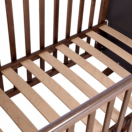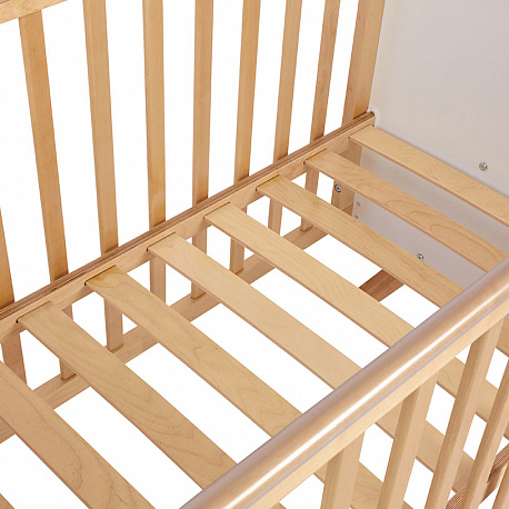 Для легкого и удобного доступа к малышу кроватка имеет опускающуюся переднюю стенку, которая быстро устанавливается на уровень ниже при одновременном нажатии системы опускания с двух сторон боковины. Это существенно облегчает процесс ухода: не придется низко наклоняться, чтобы уложить или достать кроху из кроватки.