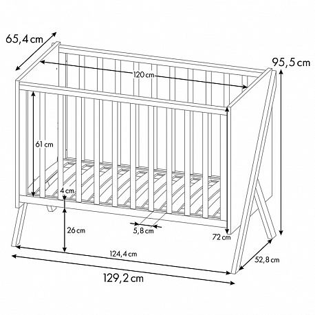 Габариты кроватки (ДхШхВ) – 129,2х65,4х95,5 см.