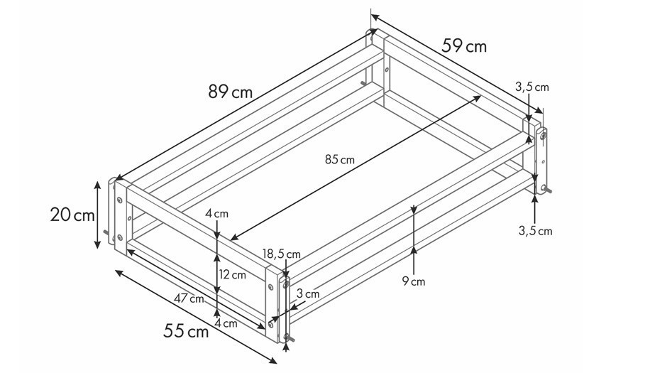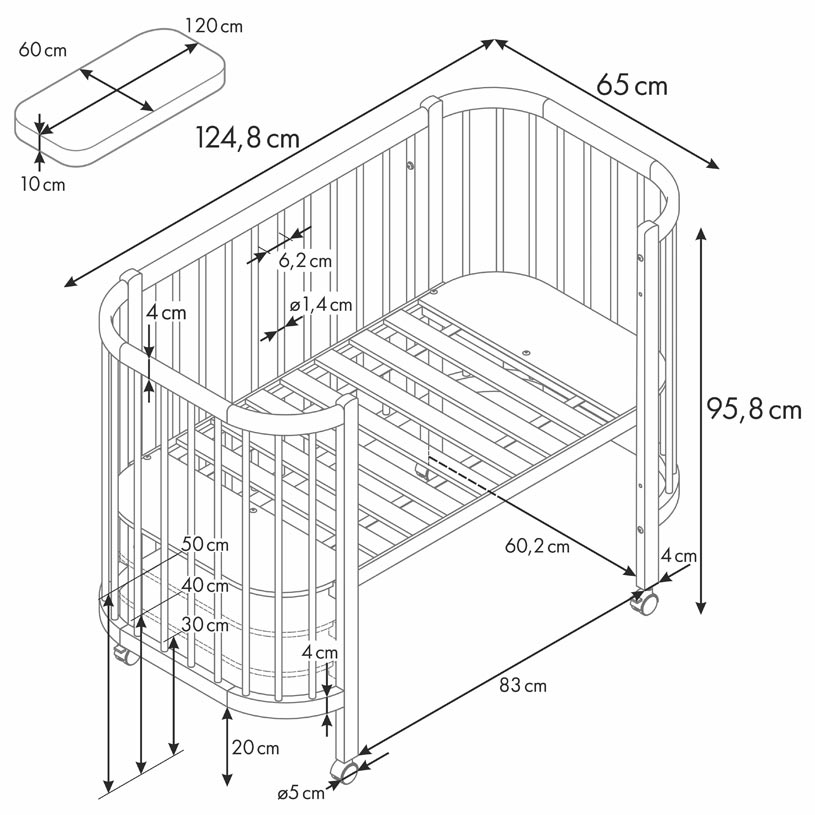 - 3 положения ложа - для новорожденных детей с 0-3 месяцев (500 мм от пола), среднее положение - для детей от 3-6 месяцев (400 мм от пола), а когда ребенок сможет самостоятельно вставать на ножки в целях безопасности ложе опускается на нижнее положение – с 6-36 месяцев (300 мм от пола);
