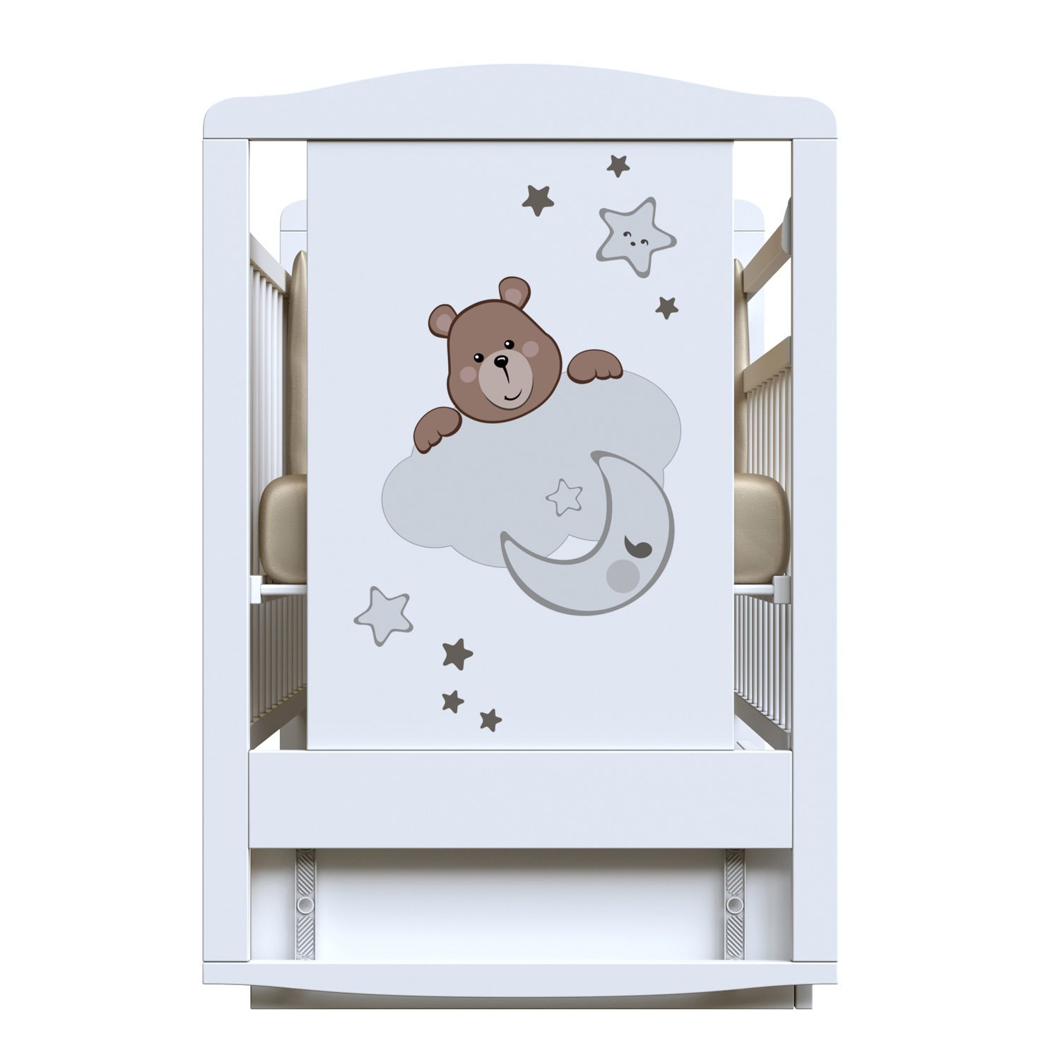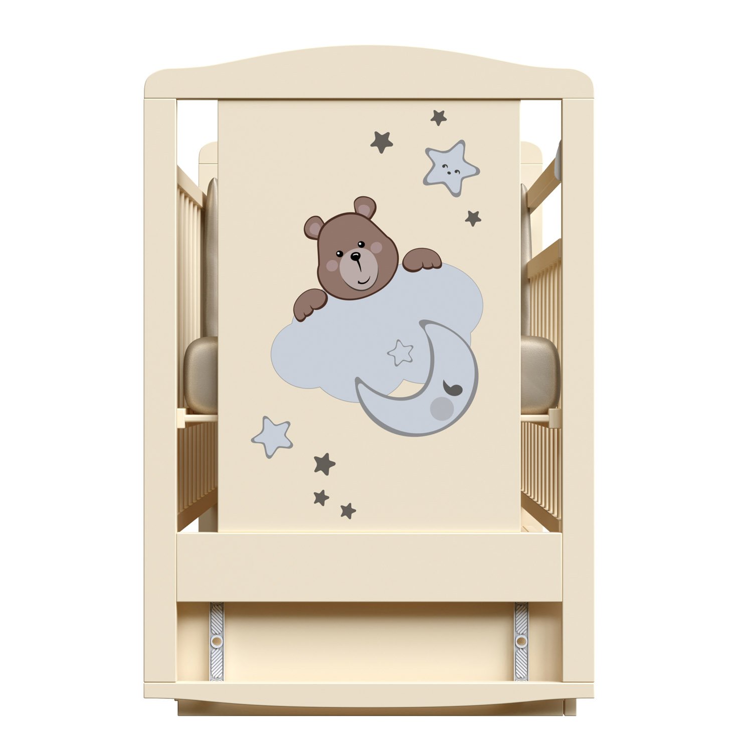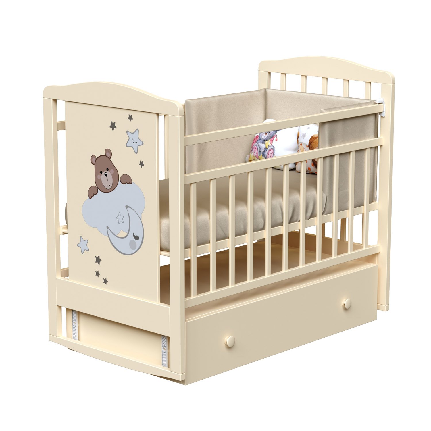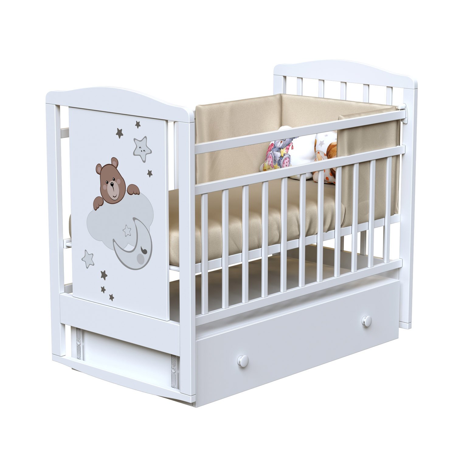 Кровать детская ВДК BIRBA (маятник-ящик) (ВДК Бирба) - удобная и красивая кроватка с детским нежным рисунком, который обязательно понравится вашему ребенку. Кровать предназначена с рождения малыша до 3-4 лет и станет безопасным и удобным местом для сна. Модель имеет все необходимые регулировки, которые сделают пользование кроваткой удобной для ребенка и его родителей: регулировка высоты ложа, откидная передняя стенка, накладки ПВХ, маятник со стопором и вместительный ящик для вещей малыша.