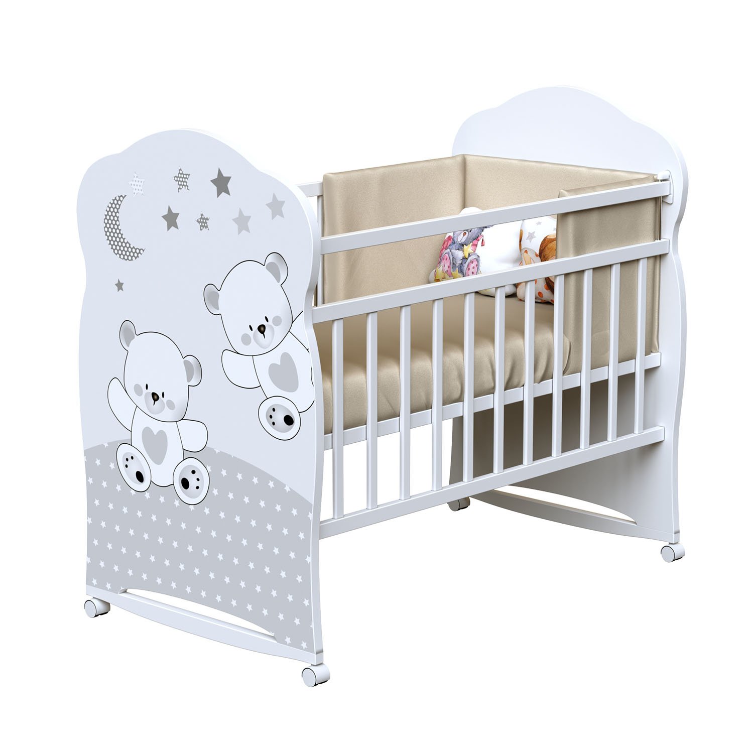 Кровать детская ВДК FUNNY BEARS (ВДК Фанни беа) (колесо-качалка) - функциональная кровать со спальным местом 120х60 см, которое рассчитано для ребенка с рождения до 4 лет. В кроватке регулируется спальное ложе по высоте, что поможет маме удобно укладывать ребенка. Передний бортик регулируется. Для безопасности ребенка бортики покрыты ПВХ накладками.