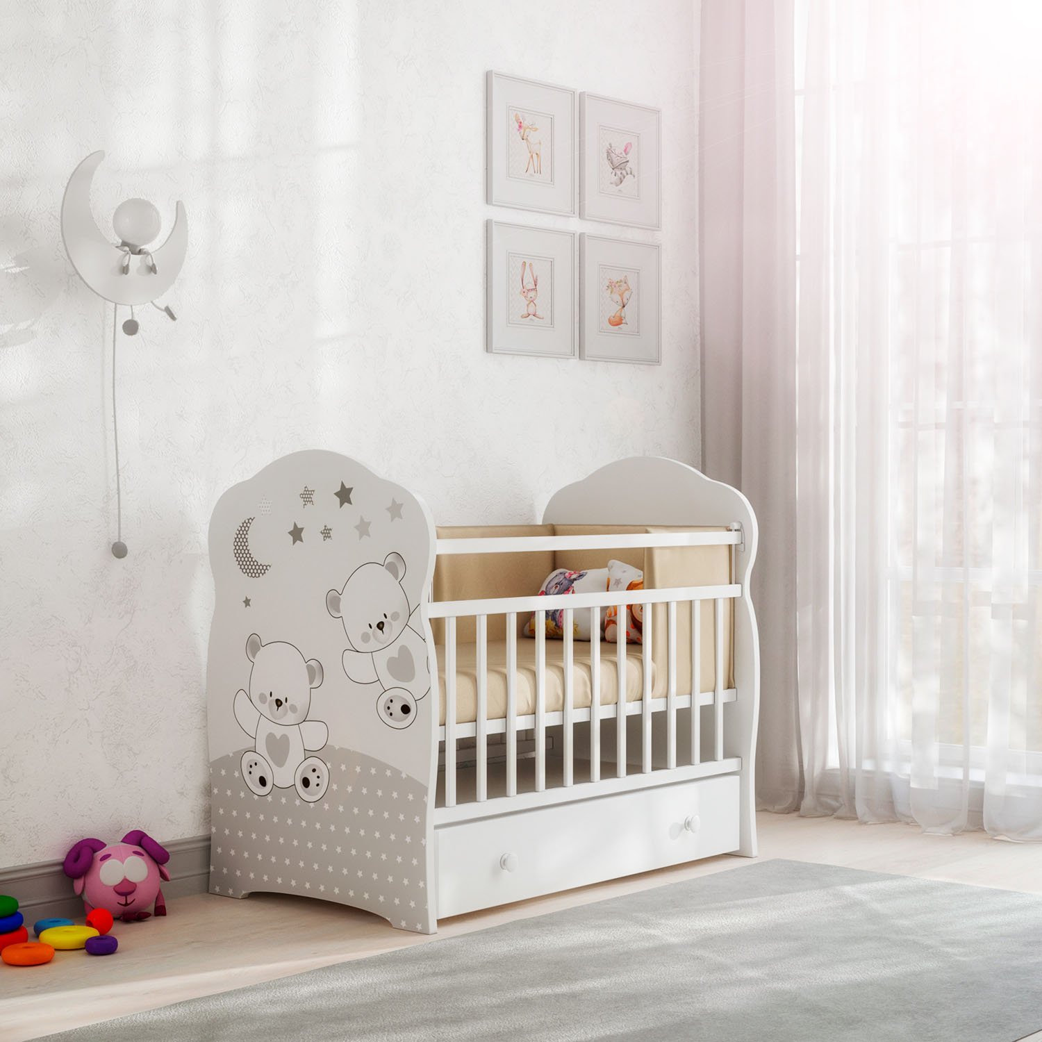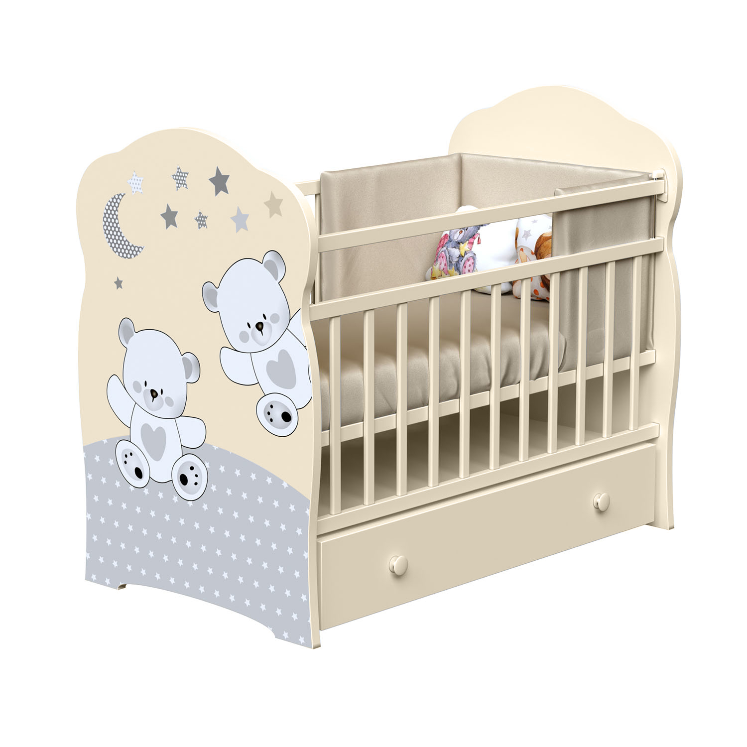 Кровать детская ВДК FUNNY BEARS (ВДК Фанни беа) - функциональная кровать со спальным местом 120х60 см, которое рассчитано для ребенка с рождения до 4 лет. В кроватке регулируется спальное ложе по высоте, что поможет маме удобно укладывать ребенка. Передний бортик регулируется. Для безопасности ребенка бортики покрыты ПВХ накладками. Для более легкого засыпания ребенка предусмотрен маятник с плавным покачивание кровати из стороны в сторону ( с фиксацией). Под кроваткой предусмотрен вместительный ящик.
