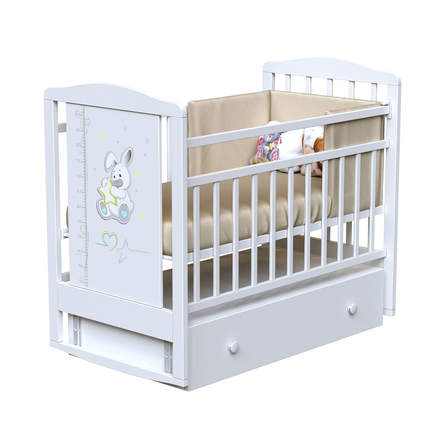Кровать детская ВДК JOE с ростомером (маятник-ящик) (ВДК Джое) - качественная и удобная кровать для ребенка с рождения. Кроватка имеет красивый дизайн и продуманный функционал, который сделает укладывание ребенка более удобным. В комплект с кроваткой входит маятник, который поможет укачивать ребенка без родительских рук, вместительный ящик для постельного белья и одеялок, накладки ПВХ, которые защитят детские зубки при прорезывании.