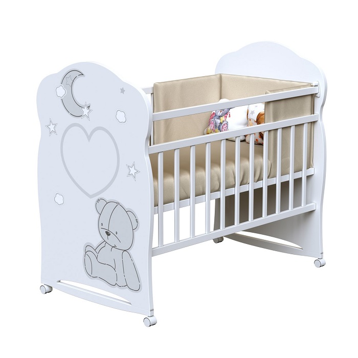 Кроватка оснащена практичными колесами, которые позволят передвигать кроватку по комнате. Дополнительно кроватка оснащена полозьями для качания (если снять колеса). Плавное покачивание из стороны в сторону будет успокаивать ребенка, настраивать на сон, позволяя быстрее уснуть и крепче спать.