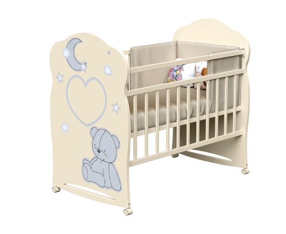 Кровать ВДК BEAR and MOON (колесо качалка) (ВДК веа енд мун) - детская кроватка для новорожденного ребенка и примерно до 3-4лет. Один бортик кроватки украшен стильным и очень милым принтом с медвежонком. Регулируемое по высоте спальное ложе 120х60 см позволит родителям удобно класть малыша в кроватку пока он маленький, а когда ребенок подрастет опустить ложе в самый низ, обеспечив ему безопасность от опрокидывания. Передний бортик регулируется по высоте для удобства родителей.