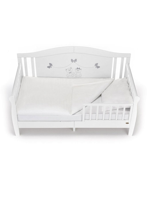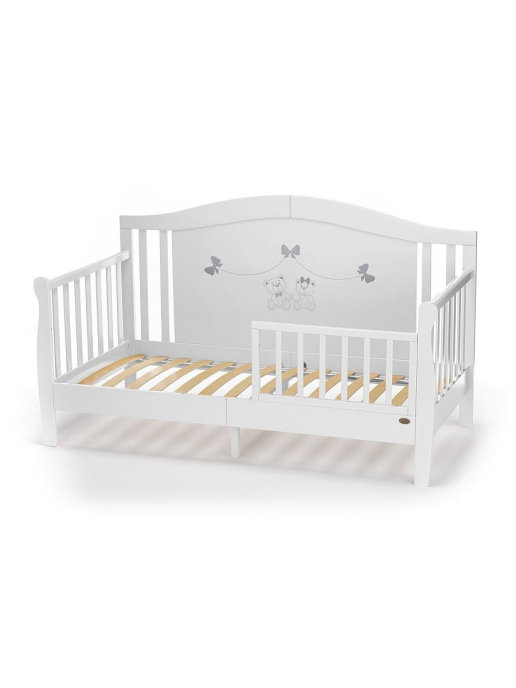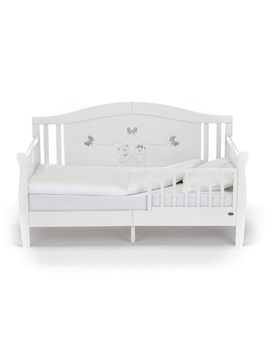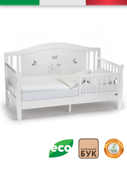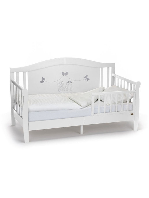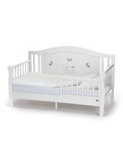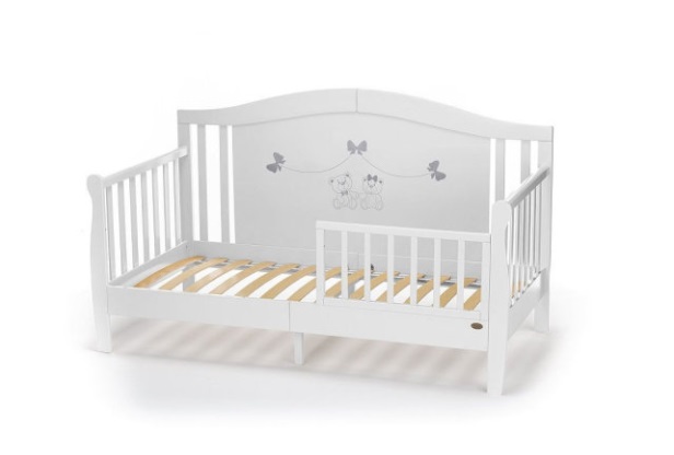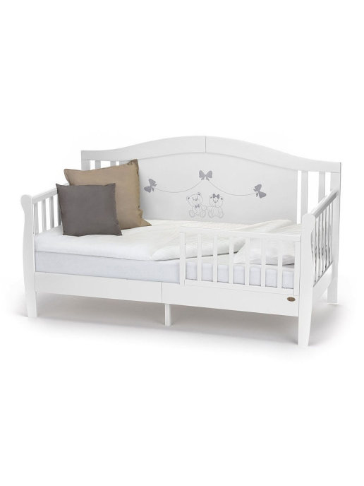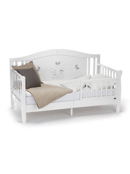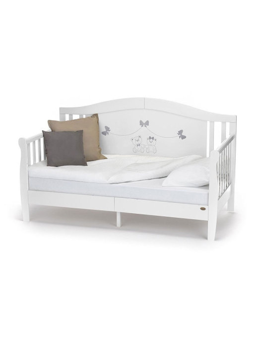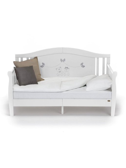 Кровать-диван Nuovita Stanzione Verona Div Fiocco (Нуовита Станзионе верона див фиокко) - это прочная и надежная кровать из натурального дерева с восхитительным дизайном. Она может использоваться как в виде спального места, так и в качестве детского диванчика. Изделие отличается высоким уровнем изготовления, и длительное время сохраняет отличный внешний вид. Основание из ламелей создает условия для формирования здоровой костно-мышечной системы ребенка. Для безопасности малыша предусмотрен бортик. Спинка оформлена рисунками с автомобильной и музыкальной тематикой, узорами из сердечек и других элементов. Для покрытия применяются высококачественные красители и лаки на водной основе.
