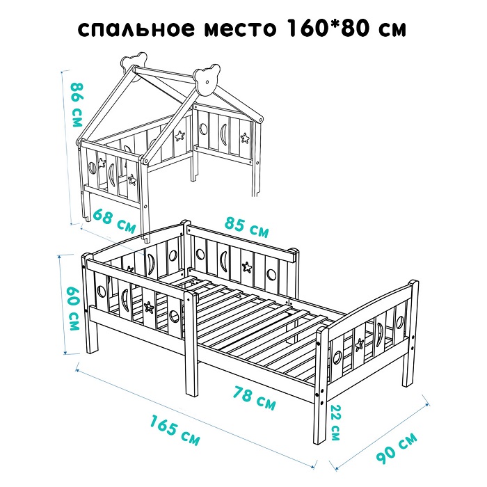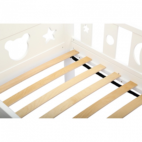 Кроватка выполнена из массива берёзы, МДФ. Это очень качественная, прочная и надежная кроватка для детей от 2 до 7 лет.