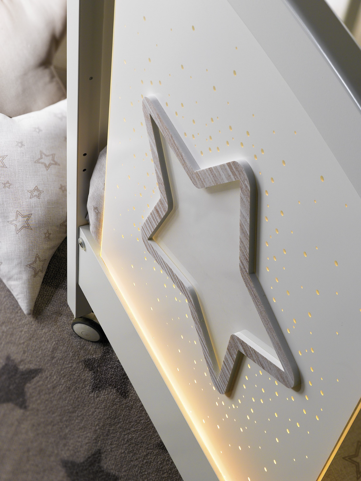 - Изголовье кроватки оснащено светодиодным освещением для создания неповторимой атмосферы в тёмное время суток.