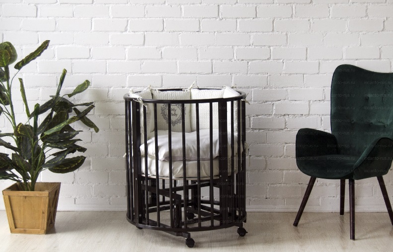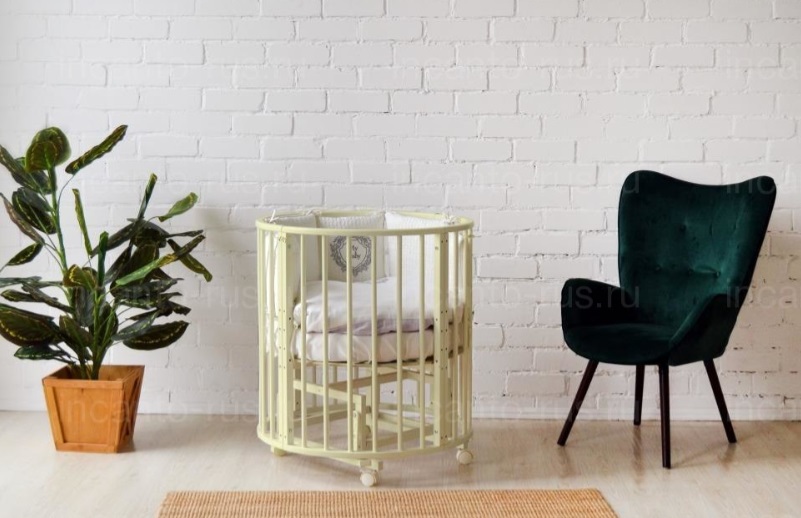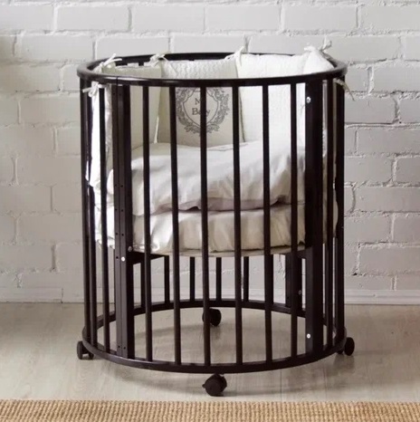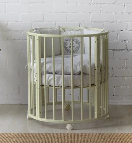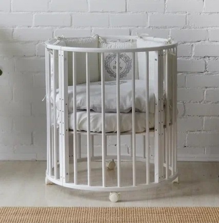 Благодаря круглой форме, колёсикам и лёгкой, но прочной древесине, из которой изготовлена кроватка мама может делать перестановку мебели хоть каждый день.