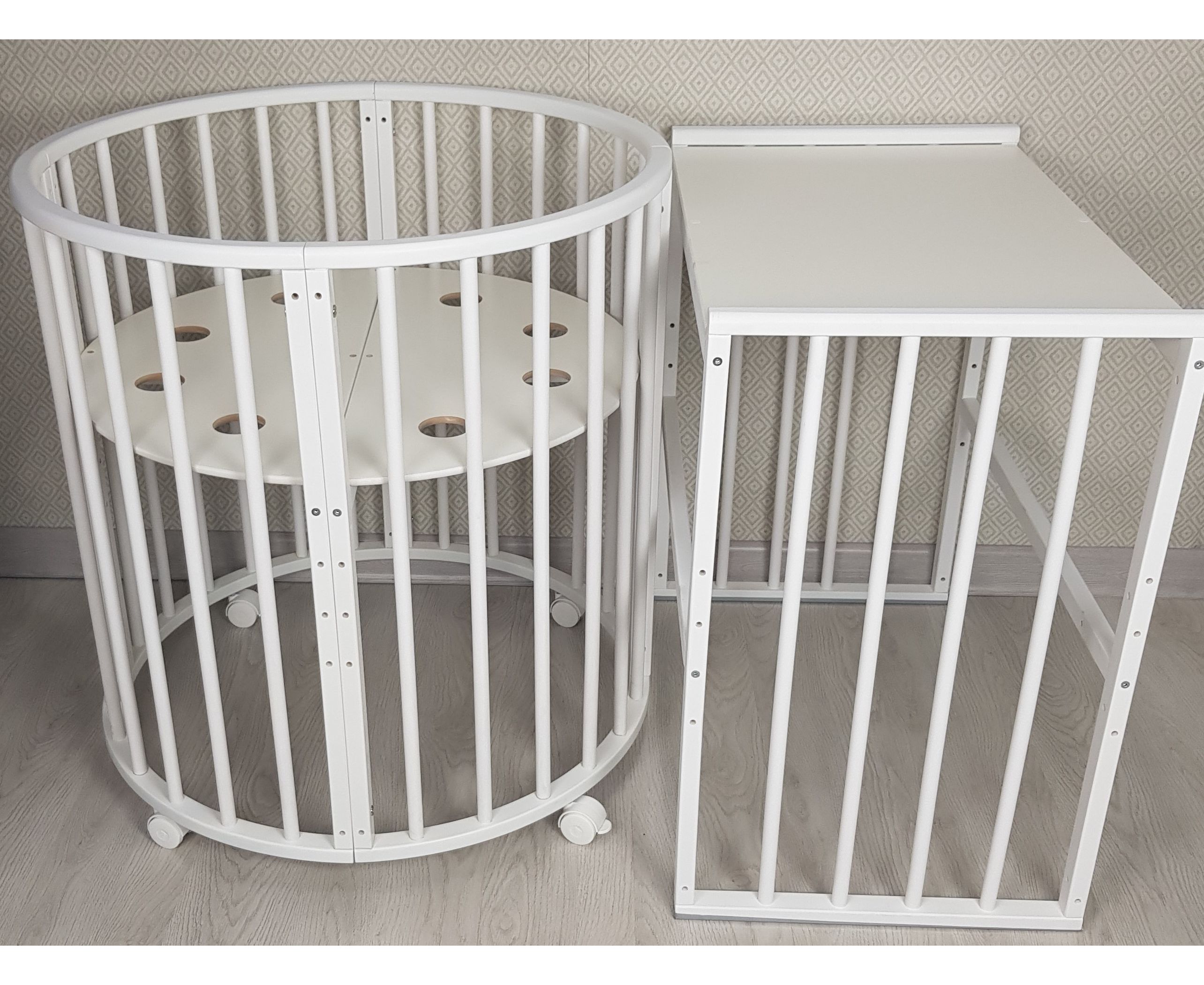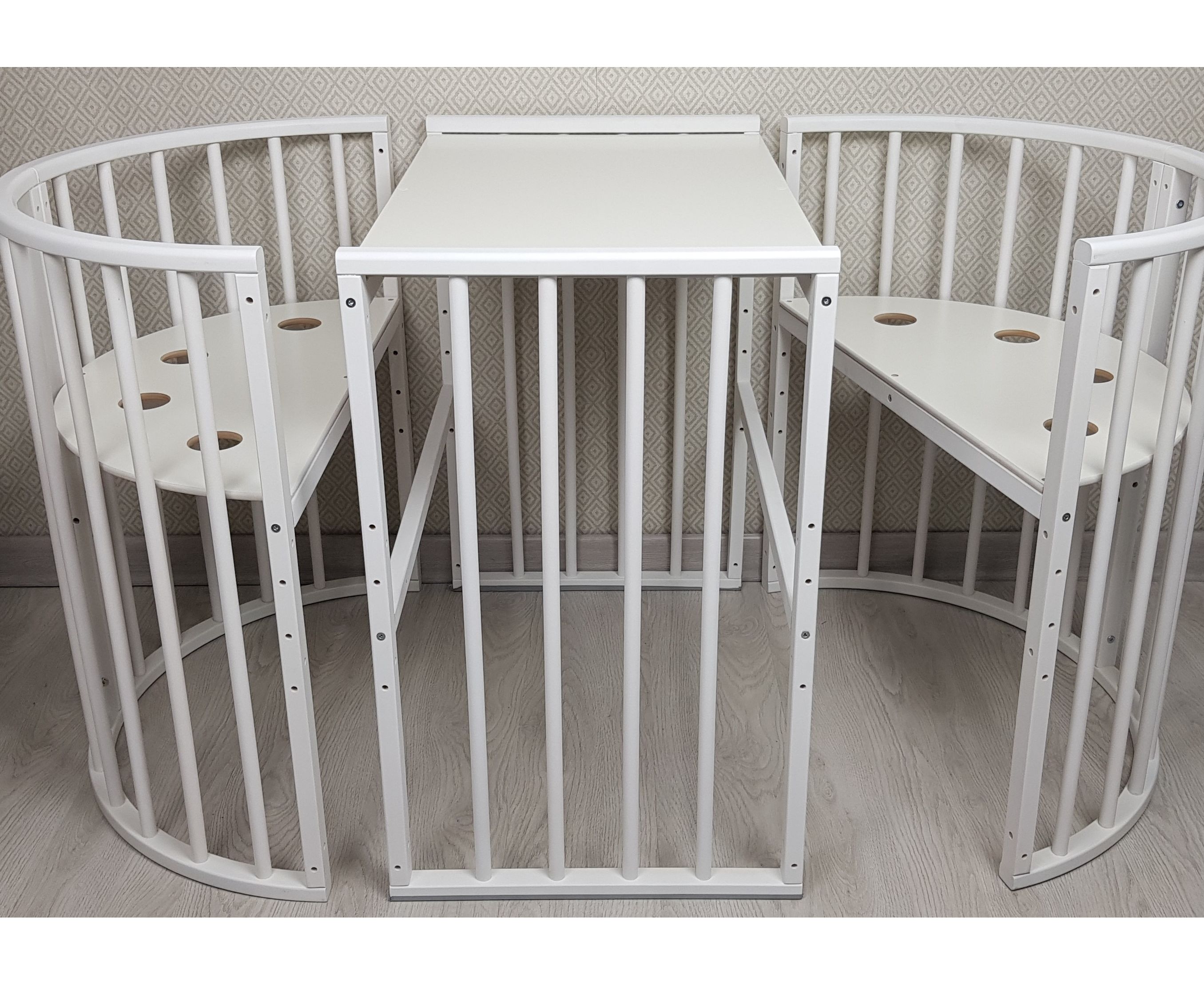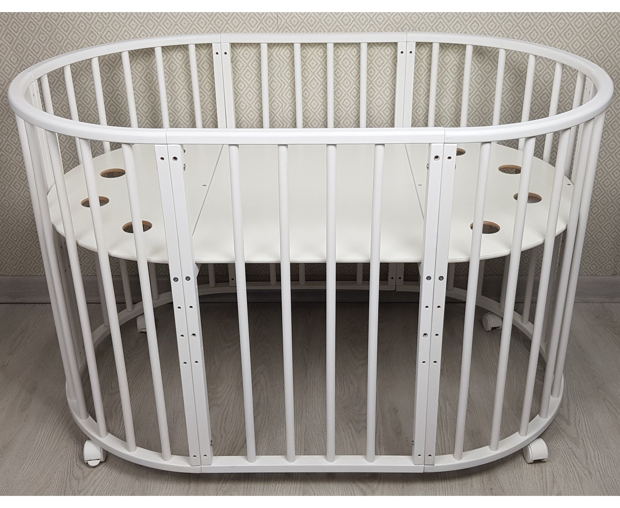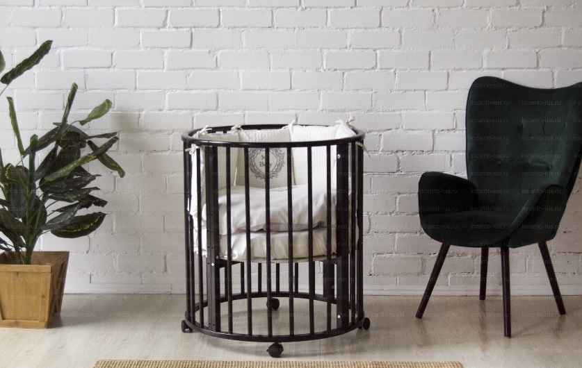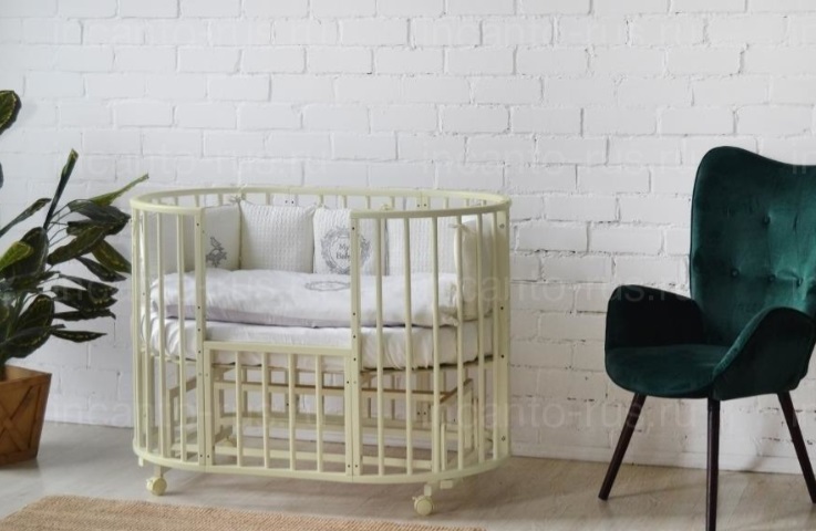 - 9 вариантов трансформации: круглая кровать, овальная, пеленальный столик ( при использовании круглой кровати), манеж, диван, приставная кровать, стол, 2 кресла.
