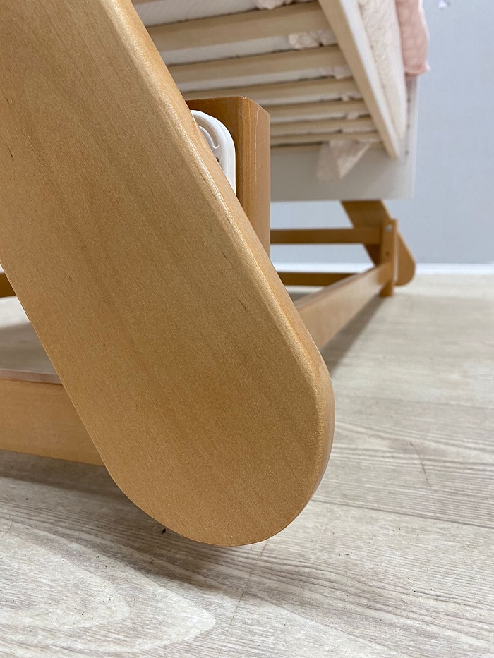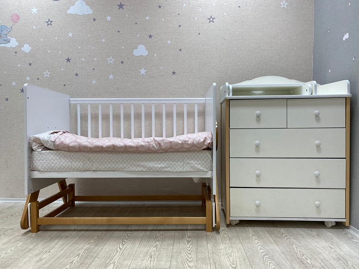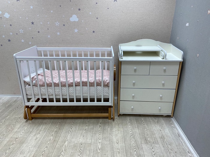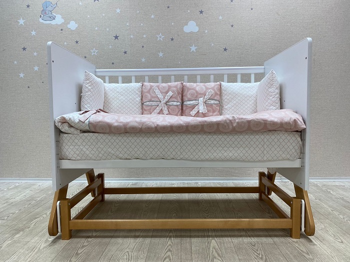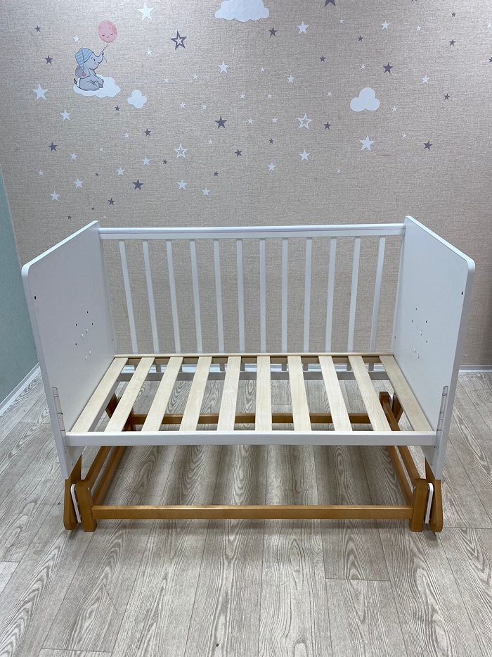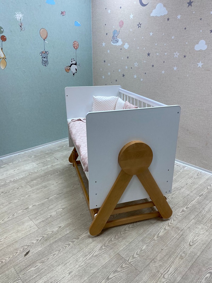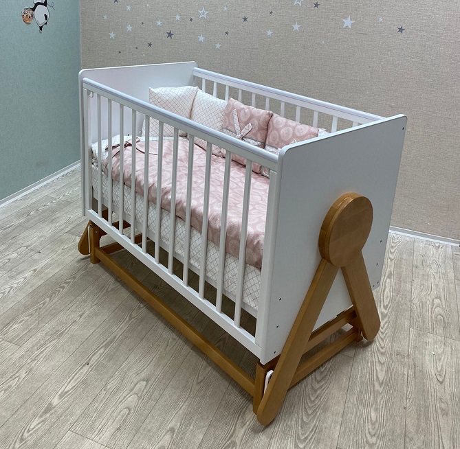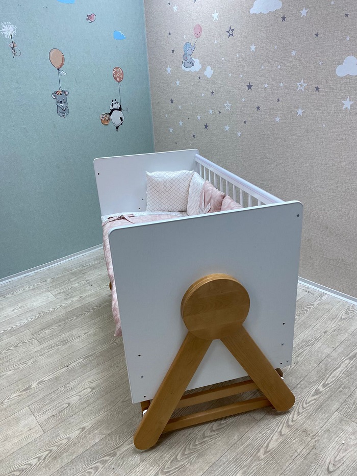 На кроватке установлен уникальный поперечный маятниковый механизм, позволяющий очень нежно укачивать малыша. Поперечный маятник качает кроватку как колыбельку из стороны в сторону. Малышу такое качание очень нравиться. Маятник помогает укачивать новорожденного ребёнка в кроватке, а не на руках. Это особенно актуально, если малышей двое, или ребёнок тяжёлый. Также маятник удобен когда ребёнок часто просыпается. В таком случае не нужно вынимать его из кроватки, чтобы младенец снова заснул. Достаточно просто покачать кроватку. Кронштейны маятника изготовлены из прочного материала, плавность качания обеспечивают восемь бесшумных подшипников. Спальное, реечное, ортопедическое ложе выполнено из неокрашенного материала и устанавливается в двух положениях по высоте. Когда ребёнок маленький, ложе поднимается повыше, чтобы маме не приходилось низко наклоняться к малышу. А когда ребёнок начнёт пытаться садиться, ложе лучше опустить, чтобы малыш не смог перевернуться и упасть с кроватки. Кроватка имеет внутренний размер 120*60 см. Предназначена для детей от рождения до 5 лет.