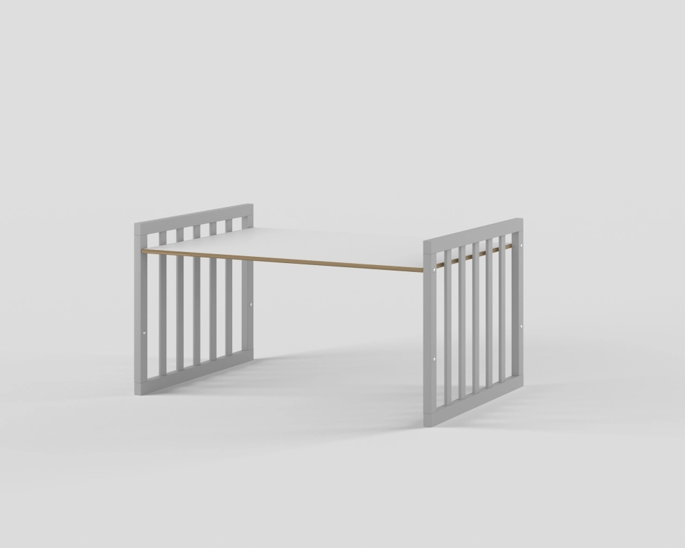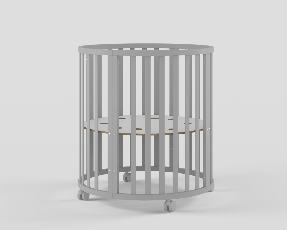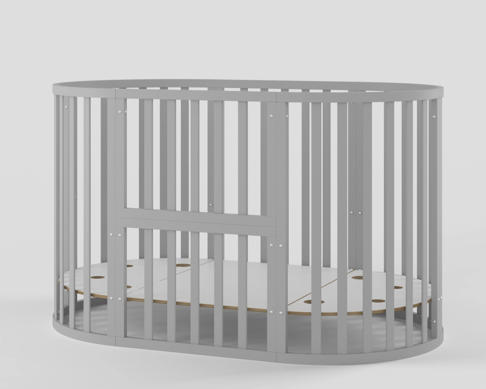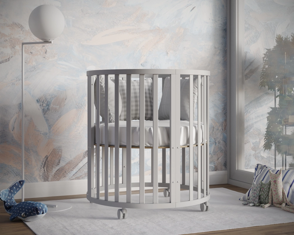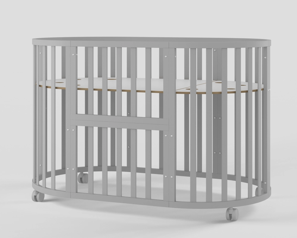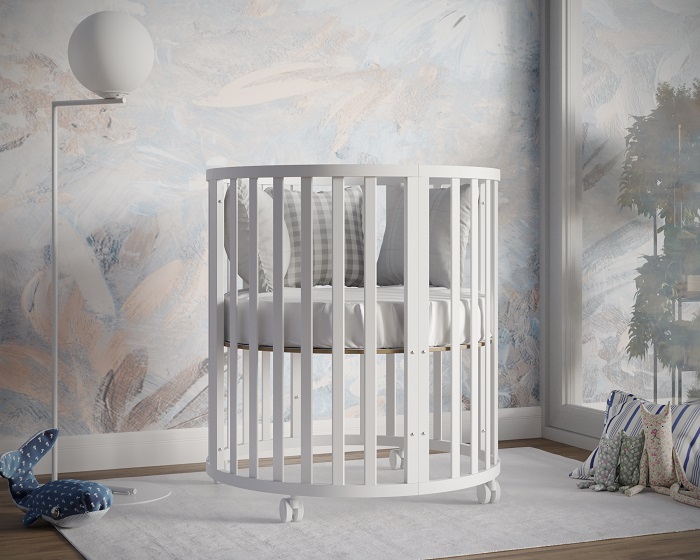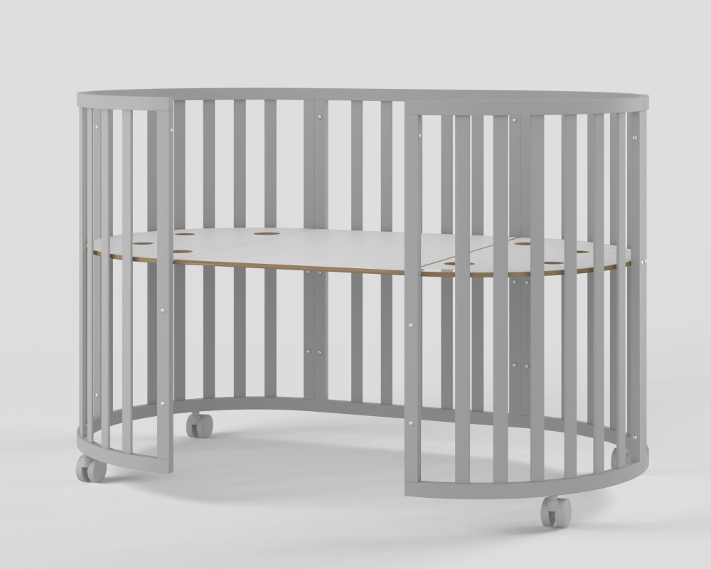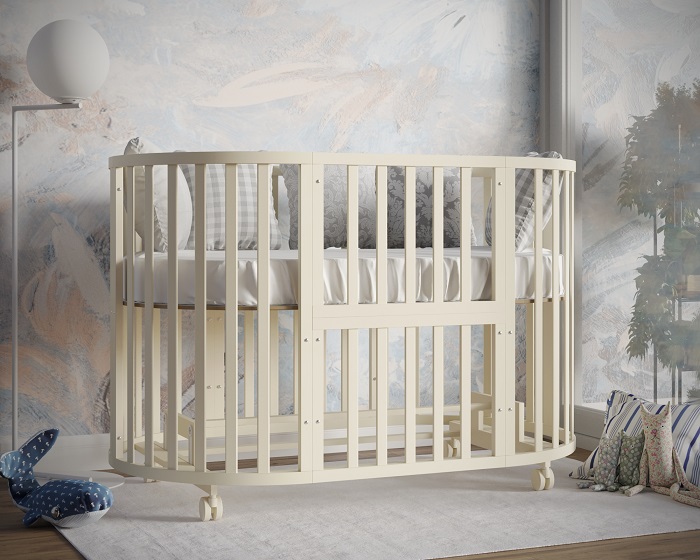 - Модель с различными вариантами трансформации: круглая кровать с пеленальным столиком, овальная кровать, манеж, приставная кровать, стол с креслами, кровать-диванчик.