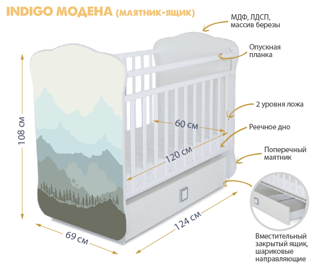 Откидная планка имеет имеет безопасный механизм опускания. С опущенной стенкой маме будет проще достать ребенка из кроватки, а поперечный маятник поможет успокоить и укачать малыша.
