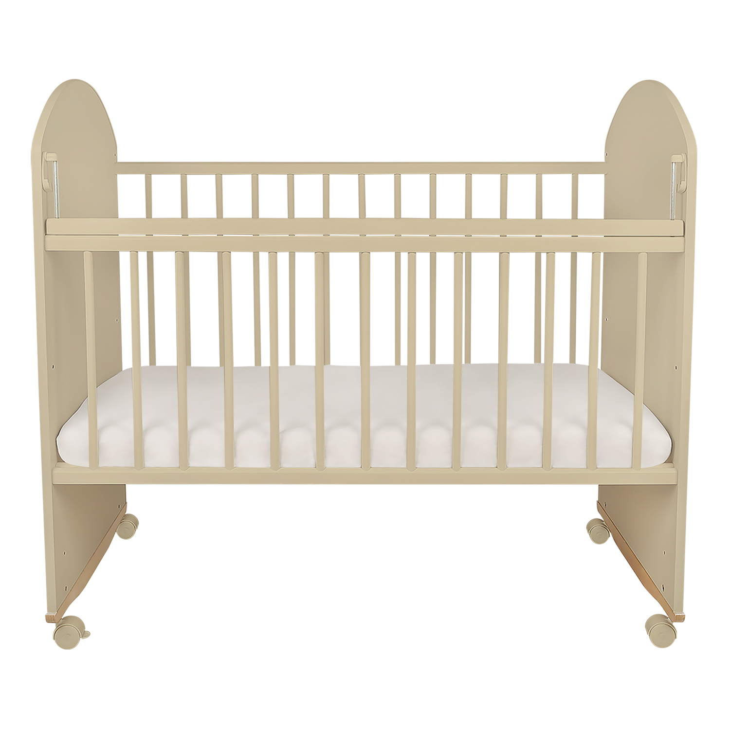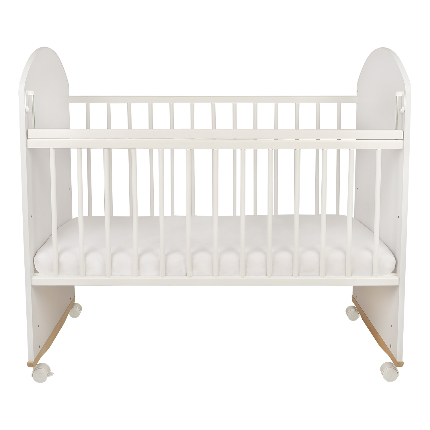 Может использоваться в двух вариантах - на колесах или как кроватка-качалка. Полукруглые полозья имеют стопоры, сохраняющие безопасную амплитуду движения, что обеспечивает комфортное колыбельное укачивание. Колеса легко снимаются и устанавливаются, оснащены стопорами-блокировками. Роликовые опоры помогут легко перемещать кроватку на нужное место.