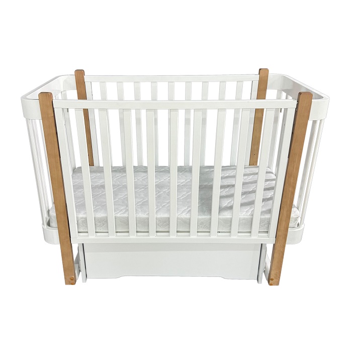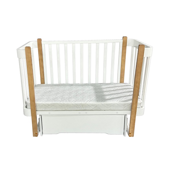 Спальное ложе кроватки Кедр Florencia с ящиком 120х60 см. Высоту подматрасника можно регулировать по высоте в 4 положениях, в зависимости от возраста ребенка. Чем старше ребенок, тем ниже необходимо опустить спальное ложе по высоте. Передняя стенка оснащена курком, который позволит быстро поменять высоту переднего бортика или его полностью снять, чтобы использовать кроватку как диванчик.