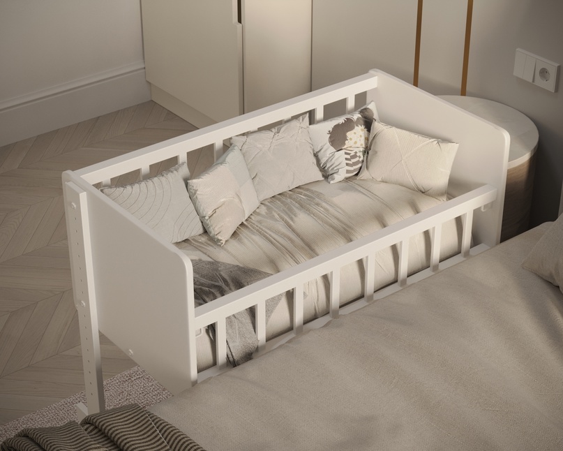 Один бортик кроватки съемный , что позволит использовать модель как приставную. Специальные ремешки позволят зафиксировать кровать рядом со взрослой, препятствуя появлению зазоров между кроватями.