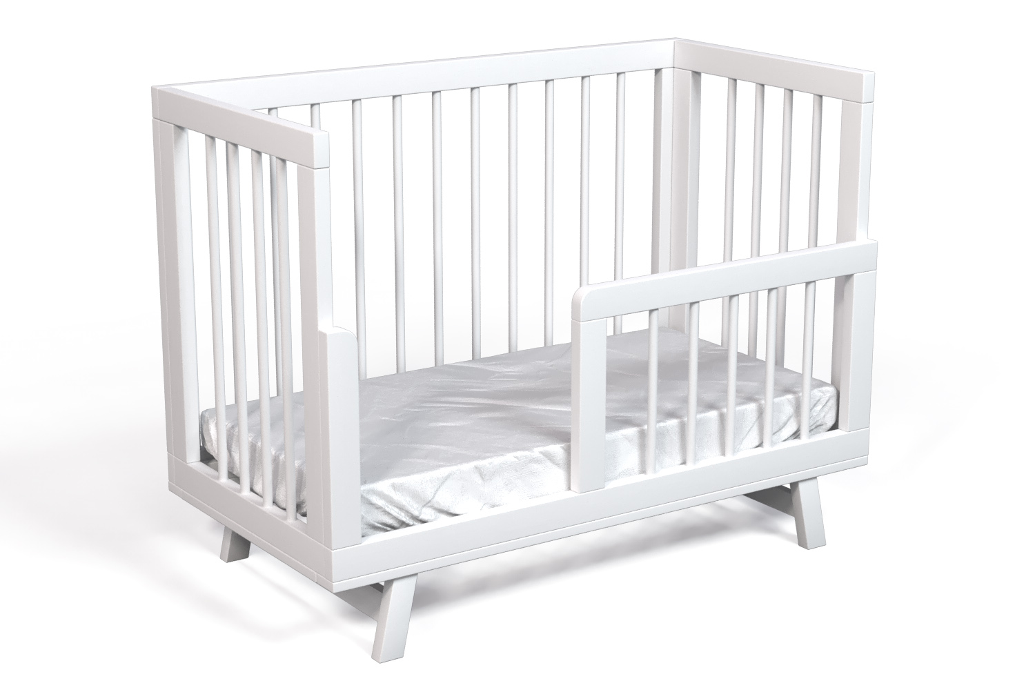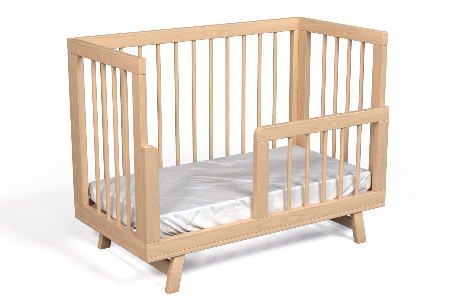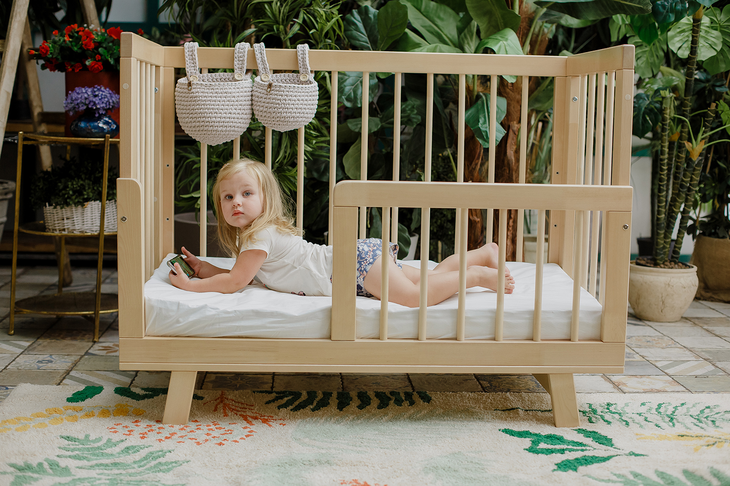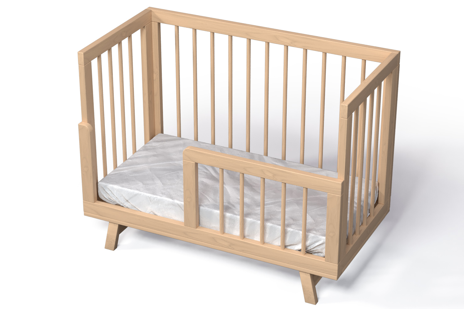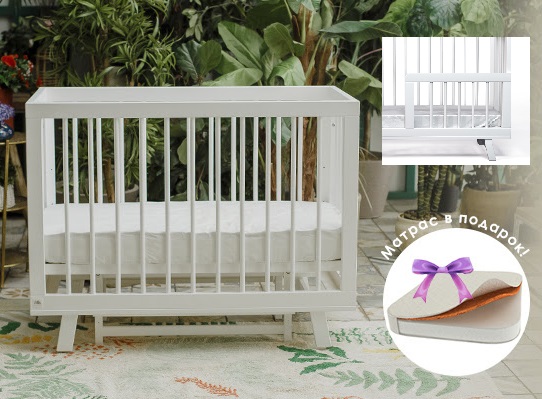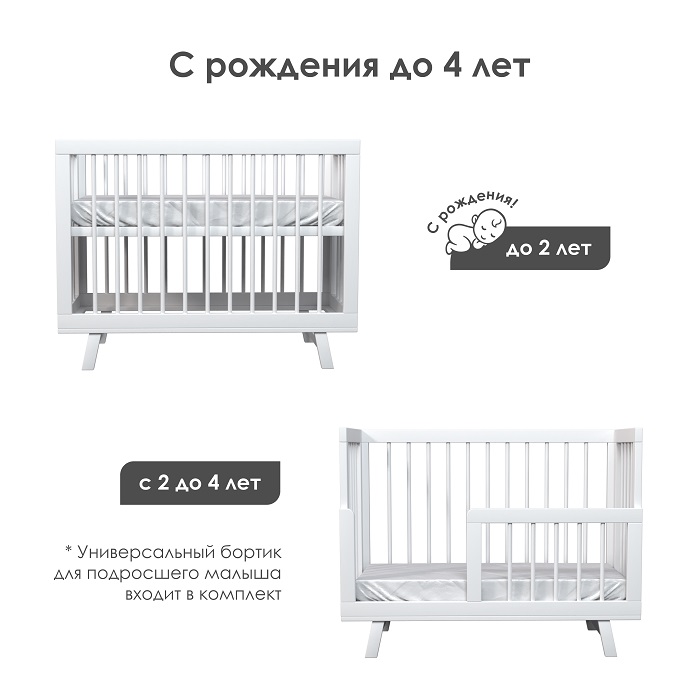 в комплект входит сменный защитный бортик с 2 лет, обеспечивающий свободный доступ в кроватку и безопасный сон подросшего малыша.